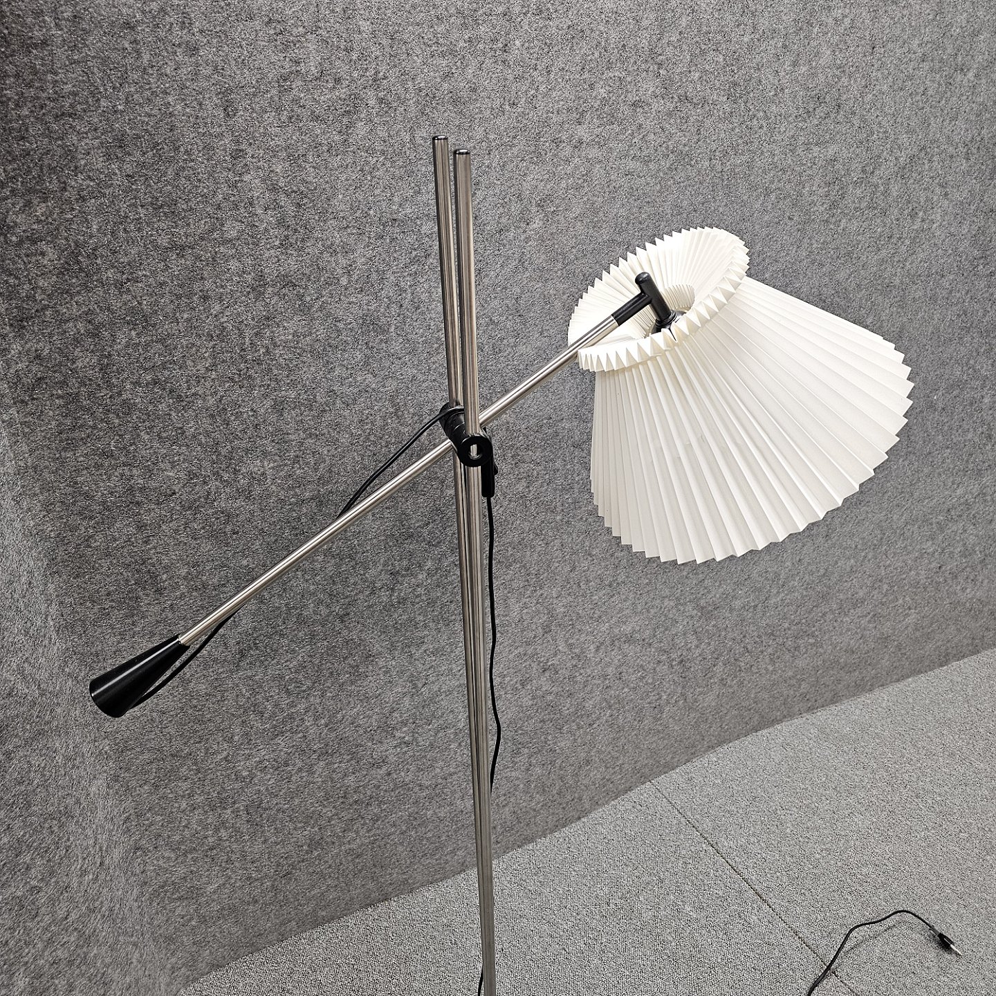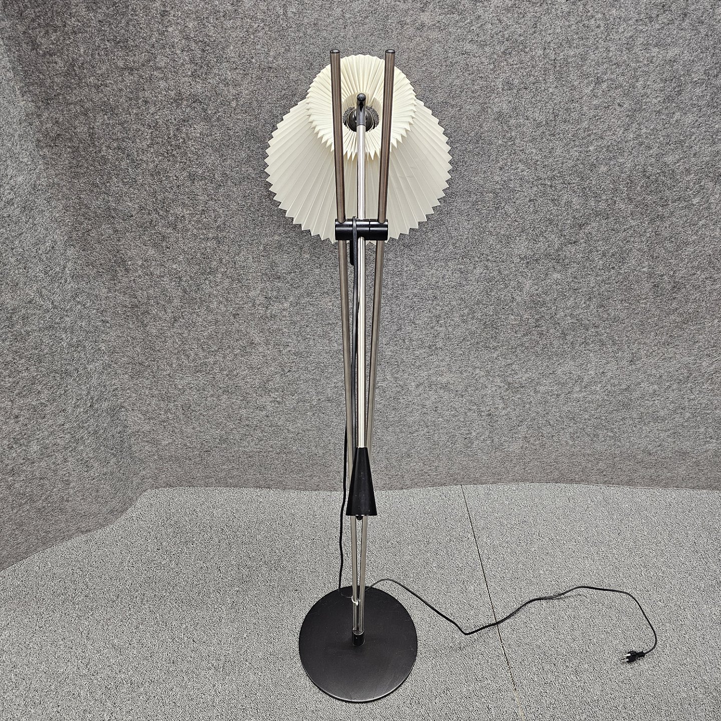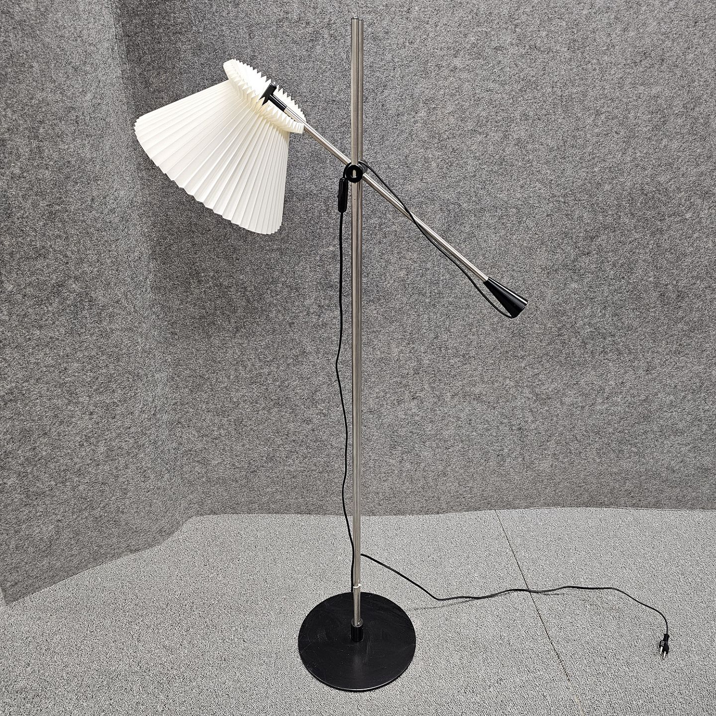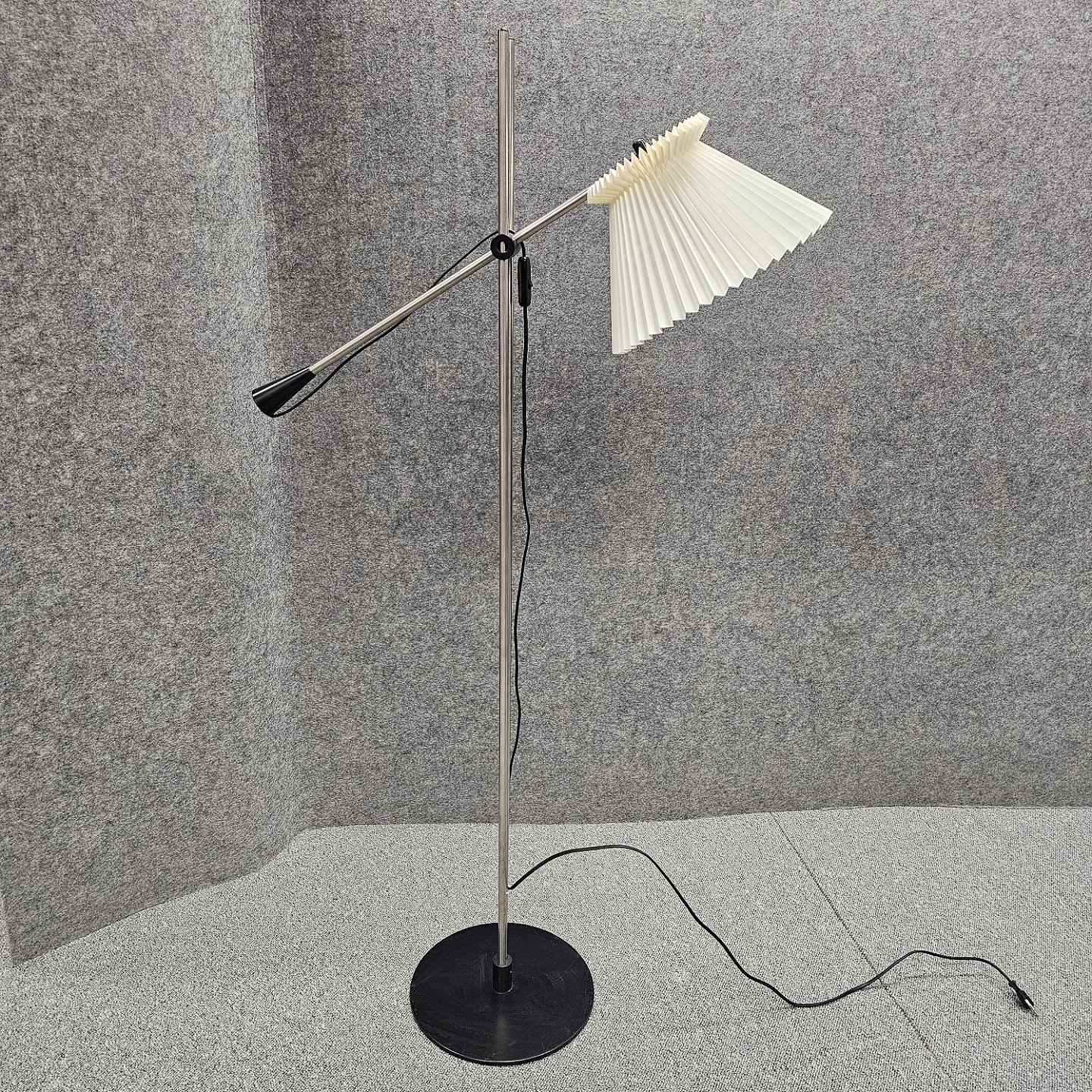 Gulvlampe i metal med sort fod, sort ledning og hvid skærm
