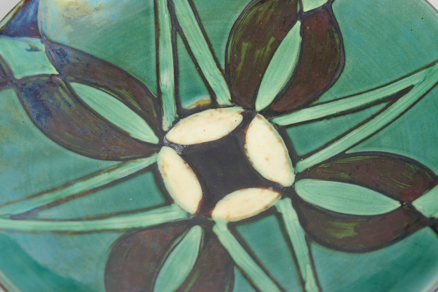 Hand-glazed faience bowl with geometric decoration in green and brown tones. A classic Art Deco expression with strong workshop character, featuring a vibrant glaze and hand-painted details.