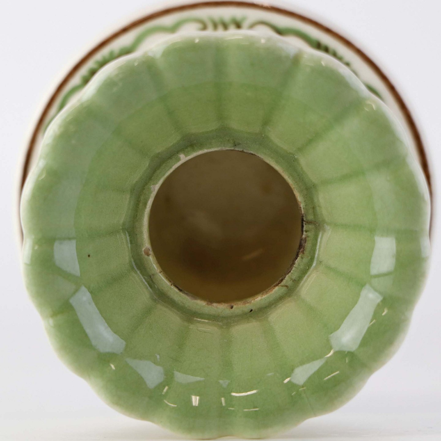 Fajancestel i stelform G med dekoration af orangegule blomster og grønne guirlander på lys baggrund med brun kant.