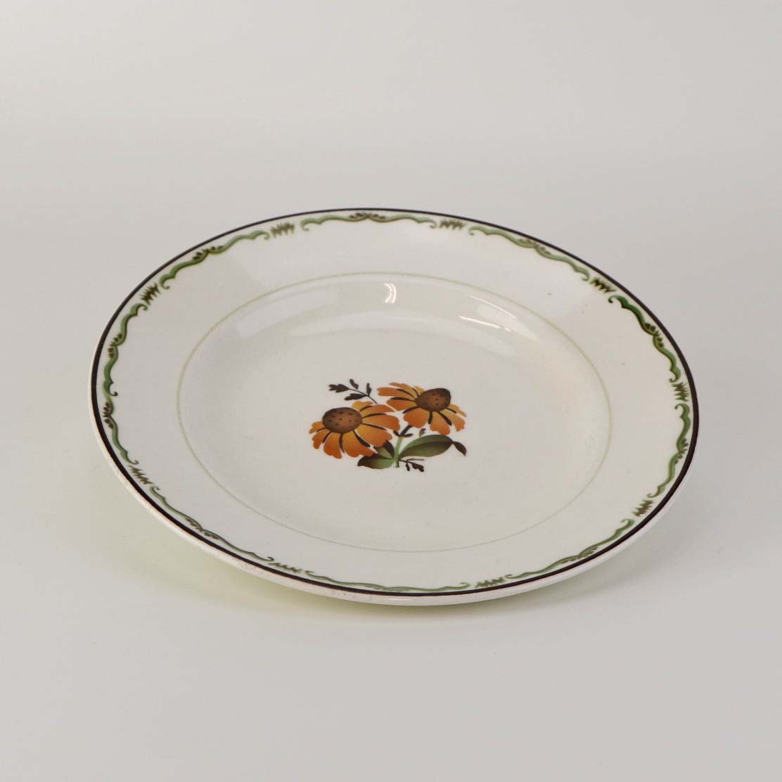 Fajancestel i stelform G med dekoration af orangegule blomster og grønne guirlander på lys baggrund med brun kant.