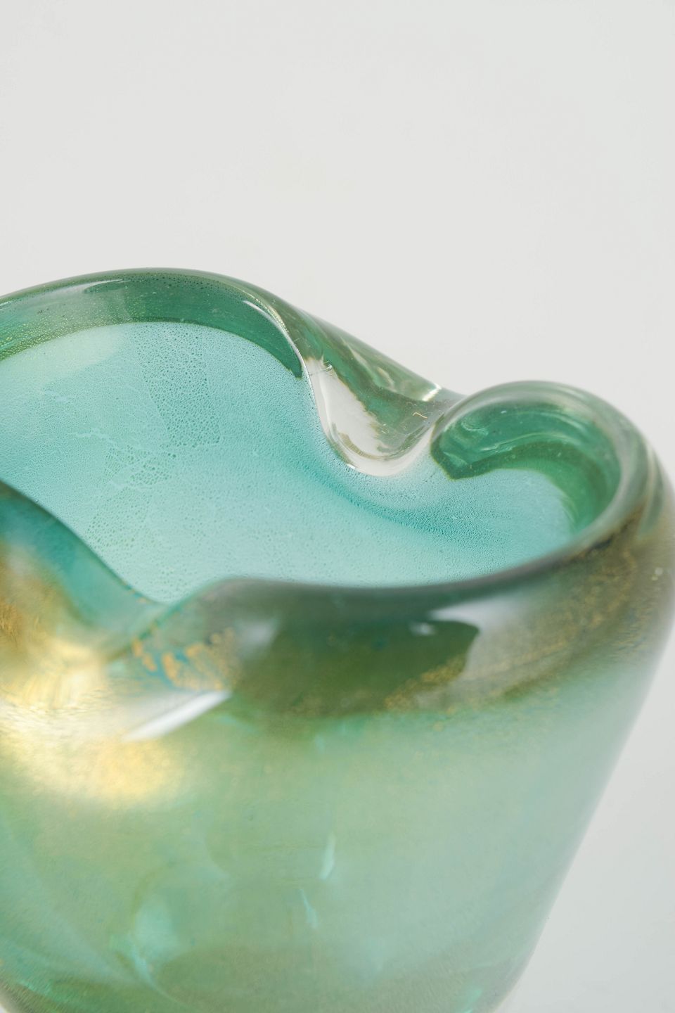 Sculptural vase in mouth-blown art glass with a free, organic opening and a gently asymmetrical rim. The glass is rendered in clear turquoise-green tones with golden inclusions, creating depth and a soft, vibrant interplay of colour. The solid, clear base provides a stable foundation and forms an elegant contrast to the coloured upper section. The form and treatment of the material are characteristic of Murano art glass from the mid-20th century.