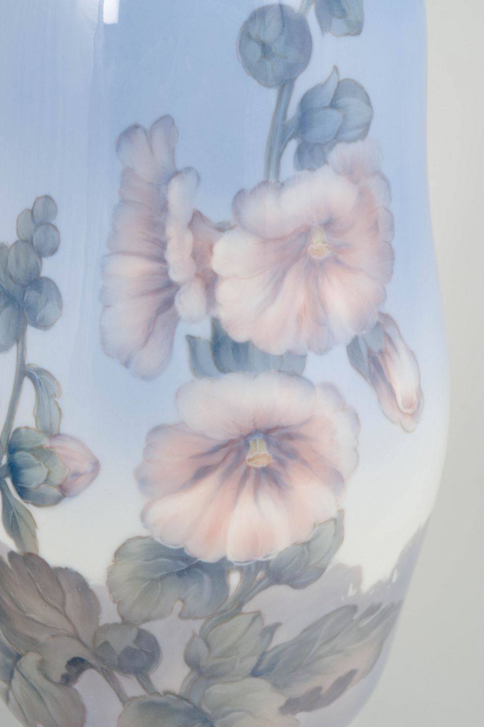 Large baluster-shaped porcelain vase with a hand-painted underglaze decoration of flowers and foliage in soft pink, green, and grey tones against a pale blue ground. The decoration is richly nuanced and well balanced with the generous proportions of the vase.