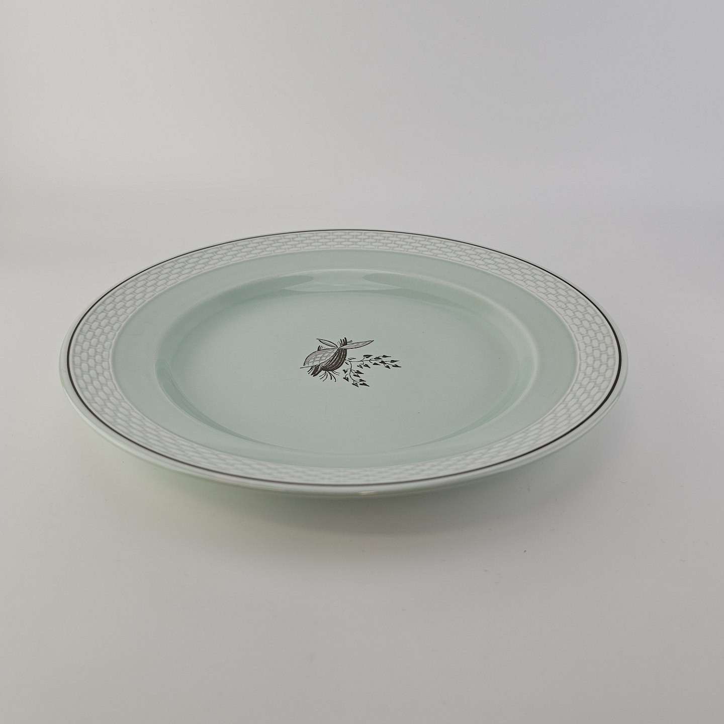 Stel i lysegrøn fajance med natur dekoration og flettet kant