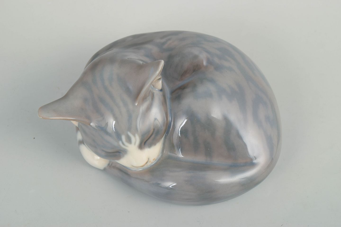 Porcelænsfigur forestillende en sammenrullet, sovende kat med blød modellering og afdæmpet gråhvid glasur med fine nuanceringer. Model 422.