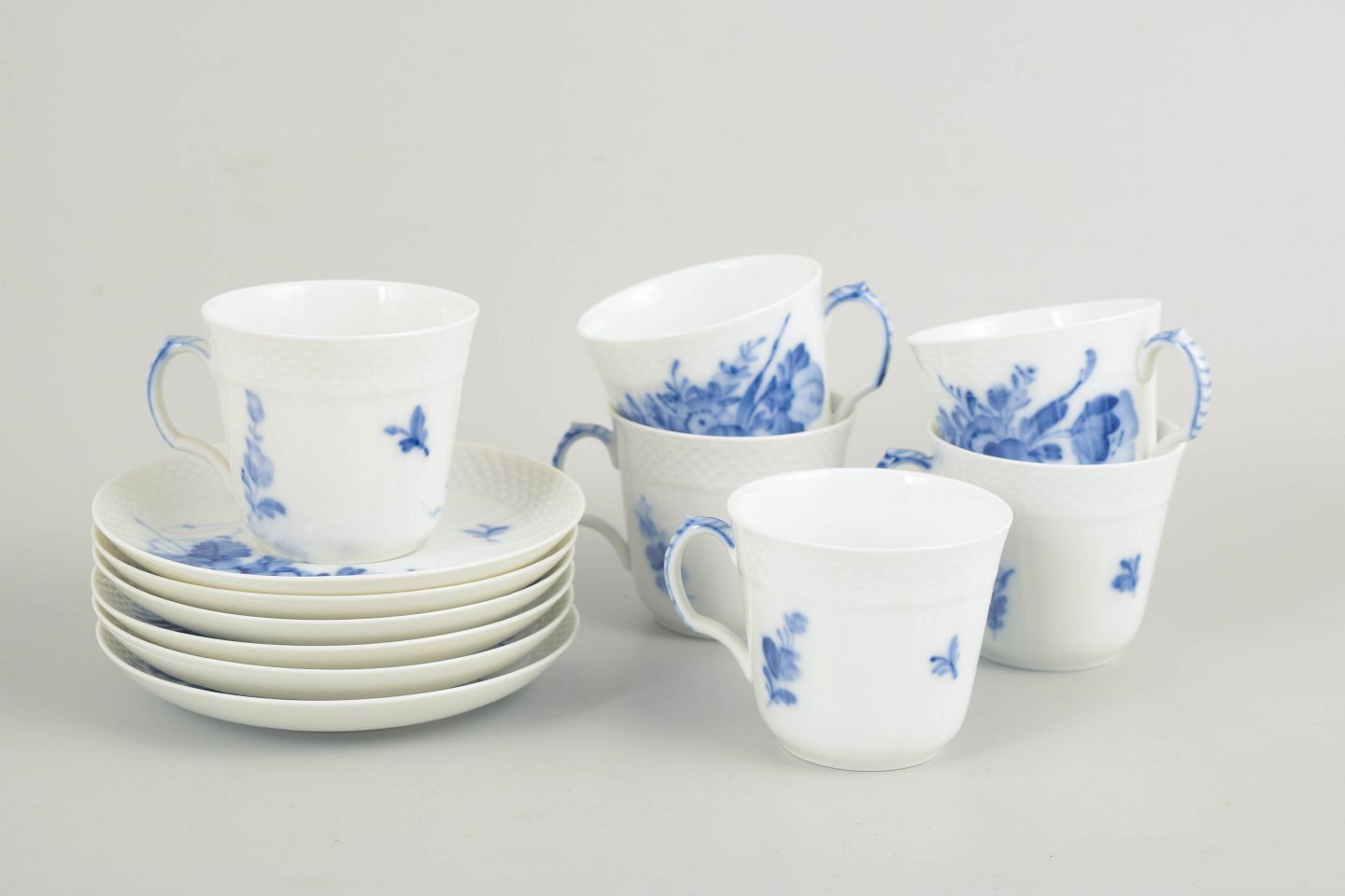 Sæt bestående af seks kaffekopper med tilhørende underkopper i glaseret porcelæn med håndmalet underglasurdekoration i det klassiske blå blomst flettede mønster. Model 10/1546.