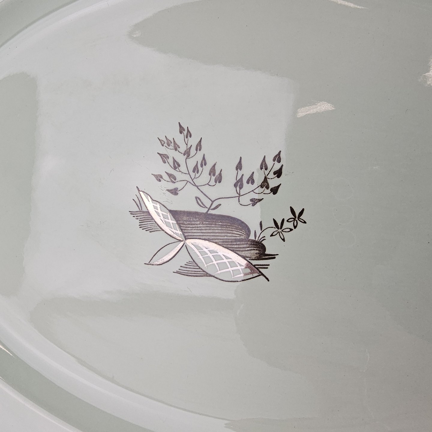 Stel i lysegrøn fajance med natur dekoration og flettet kant