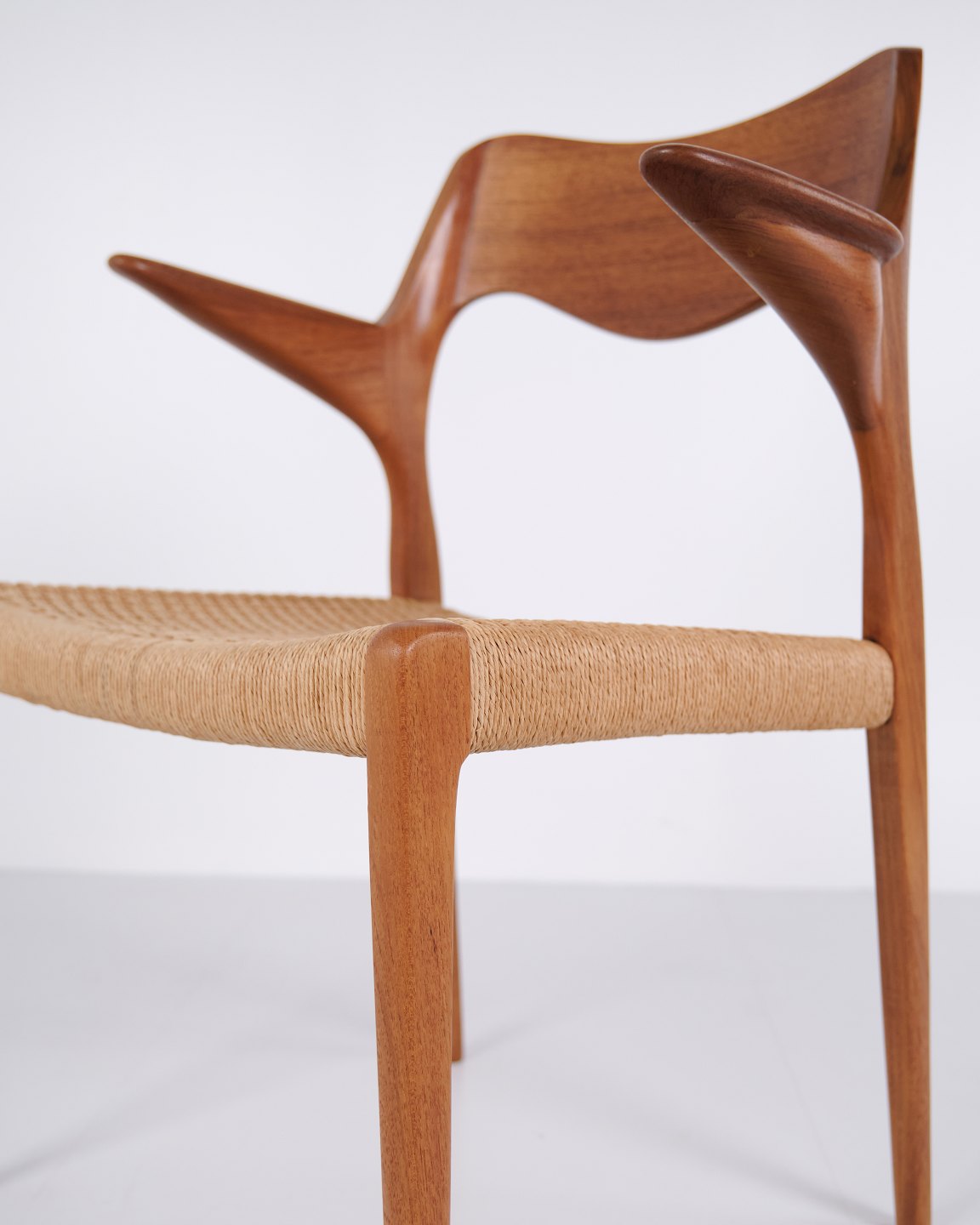Model 55 spisebordsstol af N.O. Møller for J.L. Møllers Møbelfabrik i teak og flet fra 1960’erne. Dansk design klassiker.
