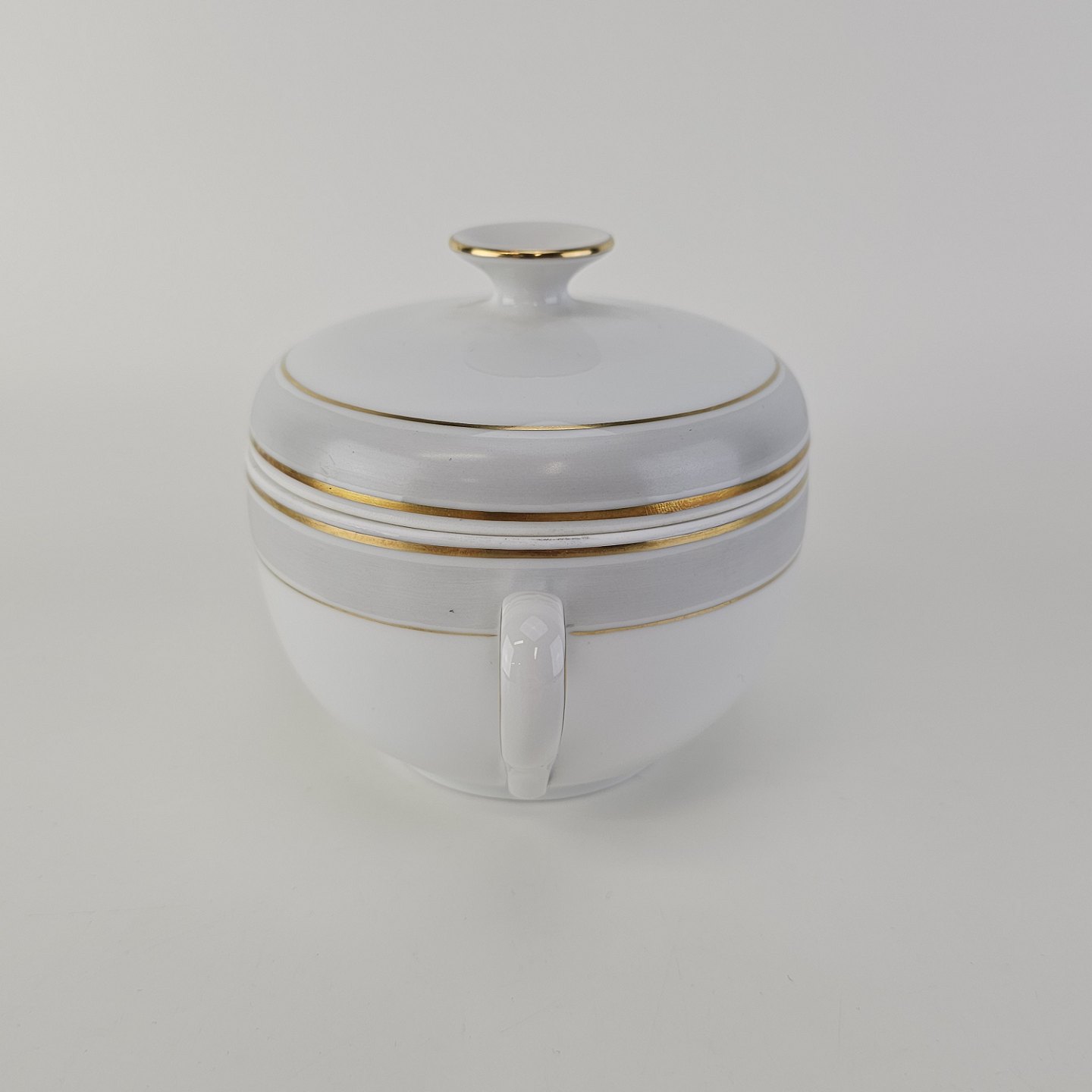 Tiber er stel i glat hvidt porcelæn med grå bort og guldkant