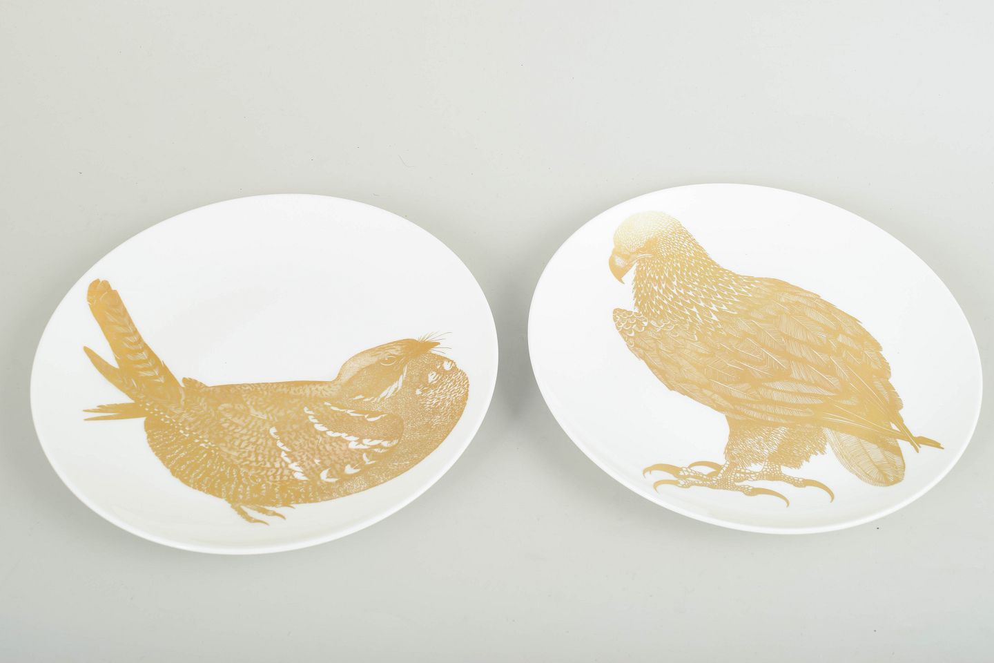 Sæt bestående af to samlertallerkener i porcelæn med fuglemotiver udført i gulddekoration. Tallerkenerne indgår i serien “Arter i fara”; den konkrete model fremgår af bagsidens tryk med titel, serienummer og artsbeskrivelse. Produceret i begrænset oplag i 1980’erne.