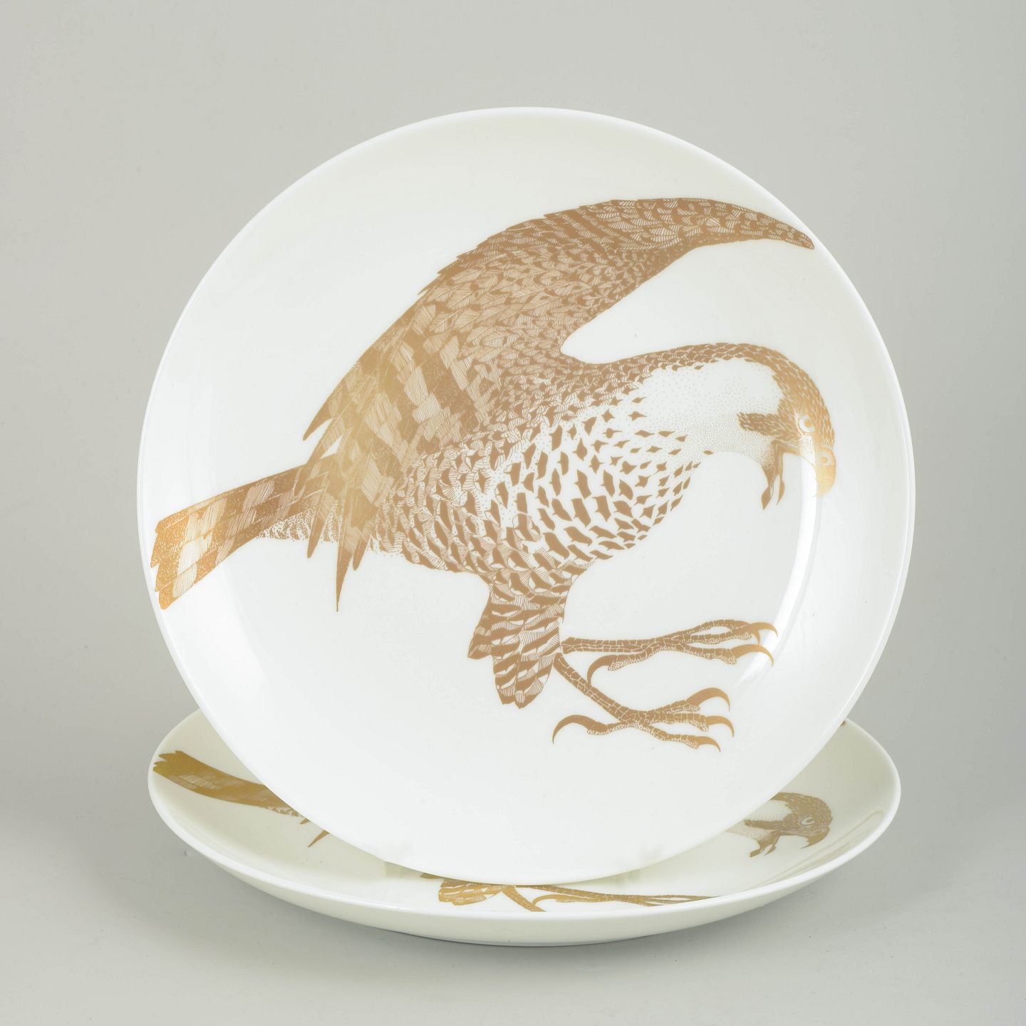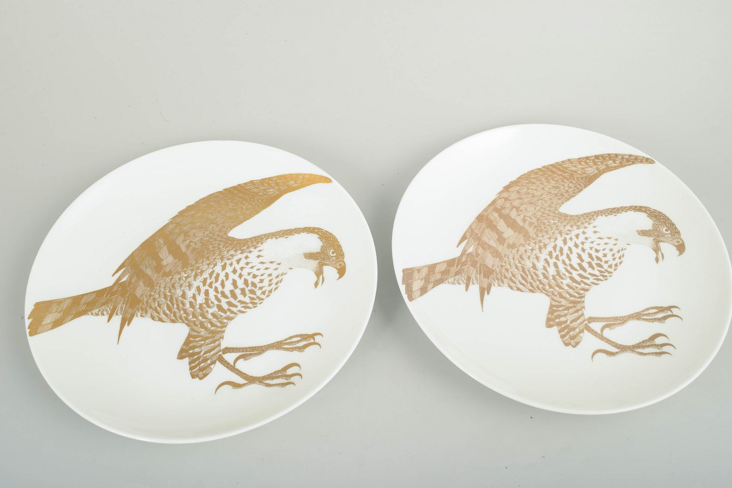 Sæt bestående af to samlertallerkener i porcelæn med motiv af havørn udført i gulddekoration. Tallerkenerne indgår i serien “Arter i fara”, model Havsörn, produceret i begrænset oplag i 1980’erne. Bagsiden er trykt med titel, serienummer og en kort naturhistorisk tekst om arten.