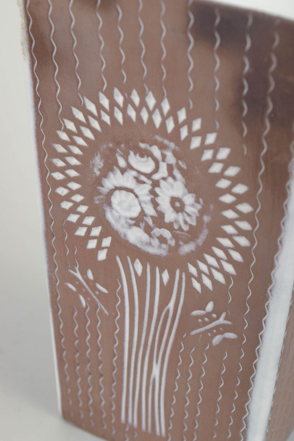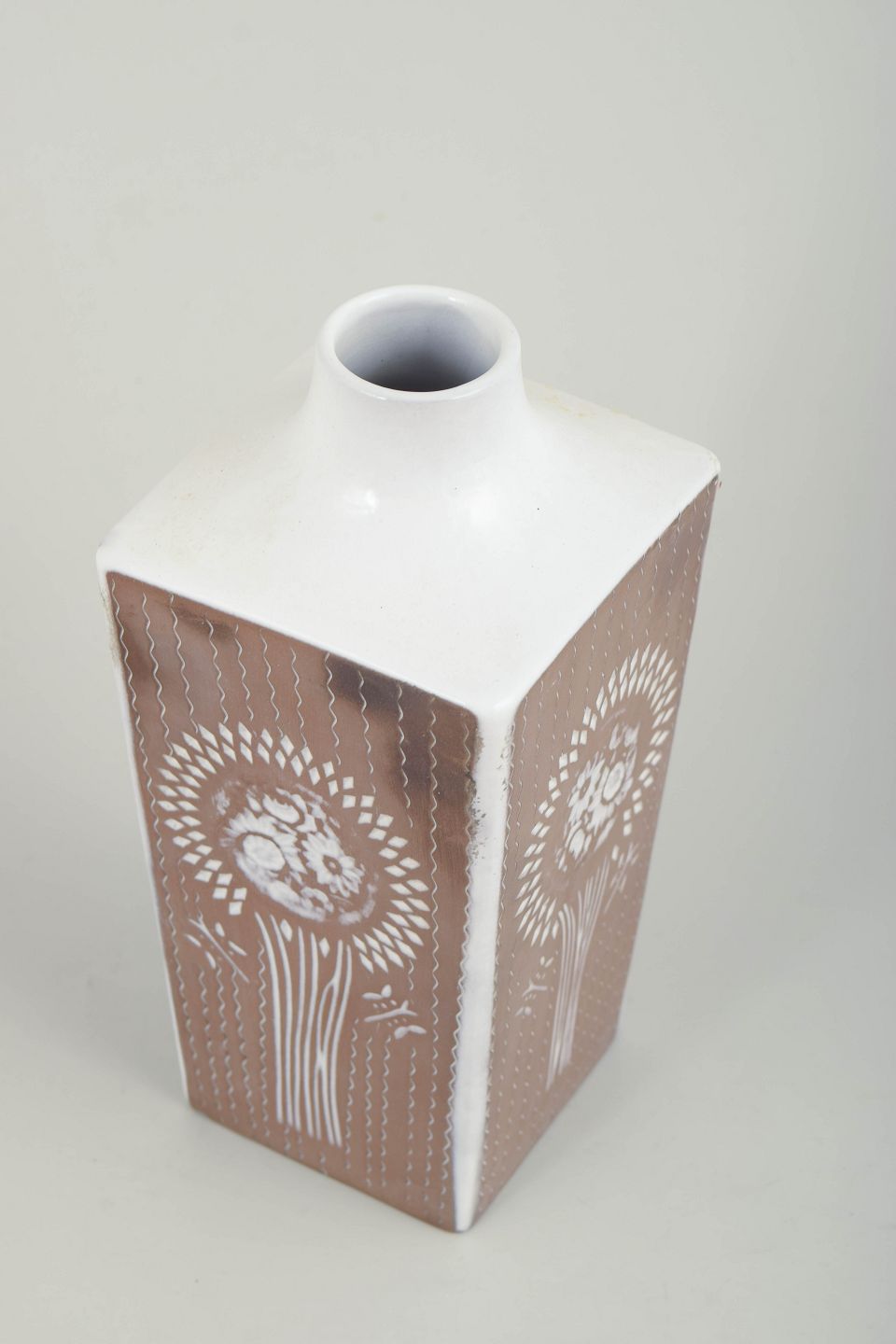 Kantet vase i glaseret keramik med firsidet korpus og kort hals. Dekoreret med stiliserede blomster- og strålemotiver i hvid mod brun bundglasur, udført i et grafisk og symmetrisk formsprog med tydelig modernistisk karakter. Modelnummer 43130/955.