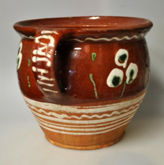 To øret krukke med udvendig brun begitning, Sorring, ca. 1870, Danmark. Dekoreret med blomster og hvide streger. H.: 18 cm. Dia.: 20 cm.