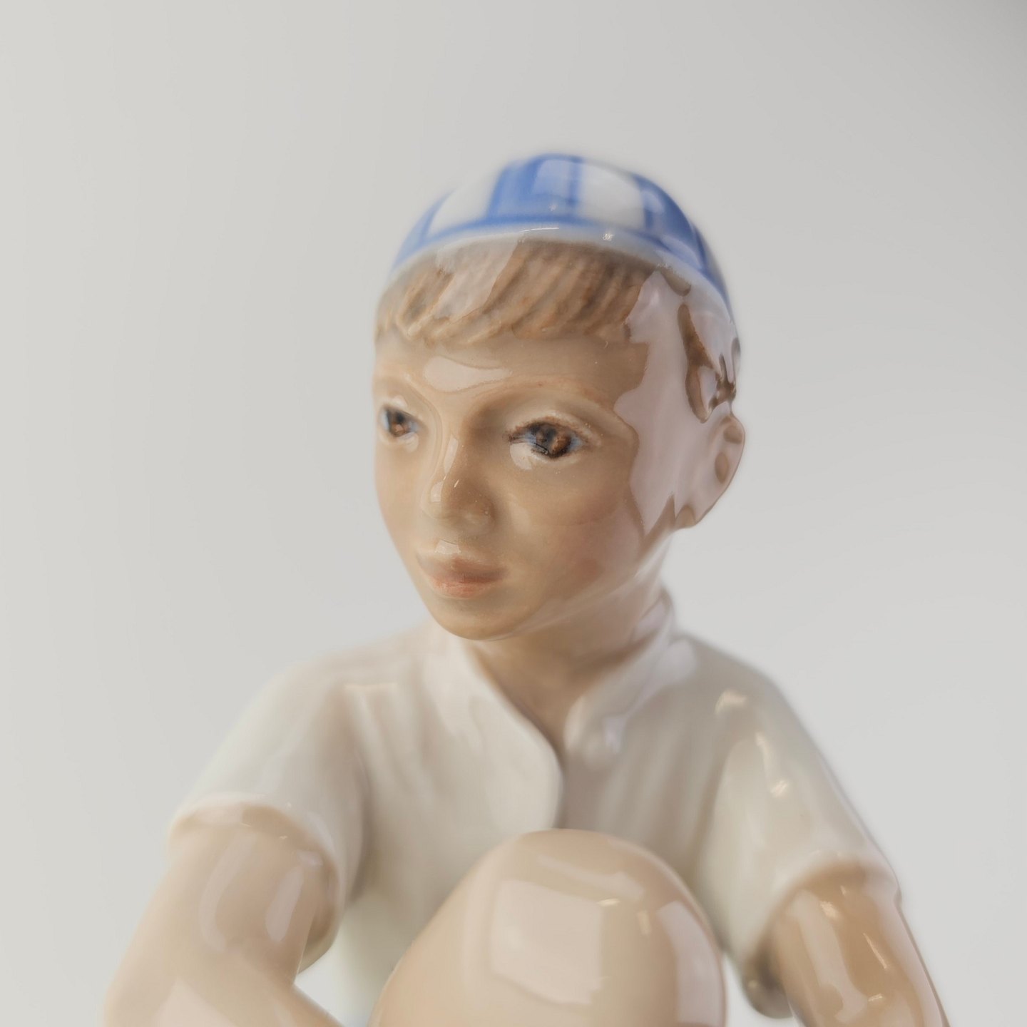 Figur i hvidt porcelæn med motiv af en dreng med navnet Ole i en stribet kasket, som sidder på sten