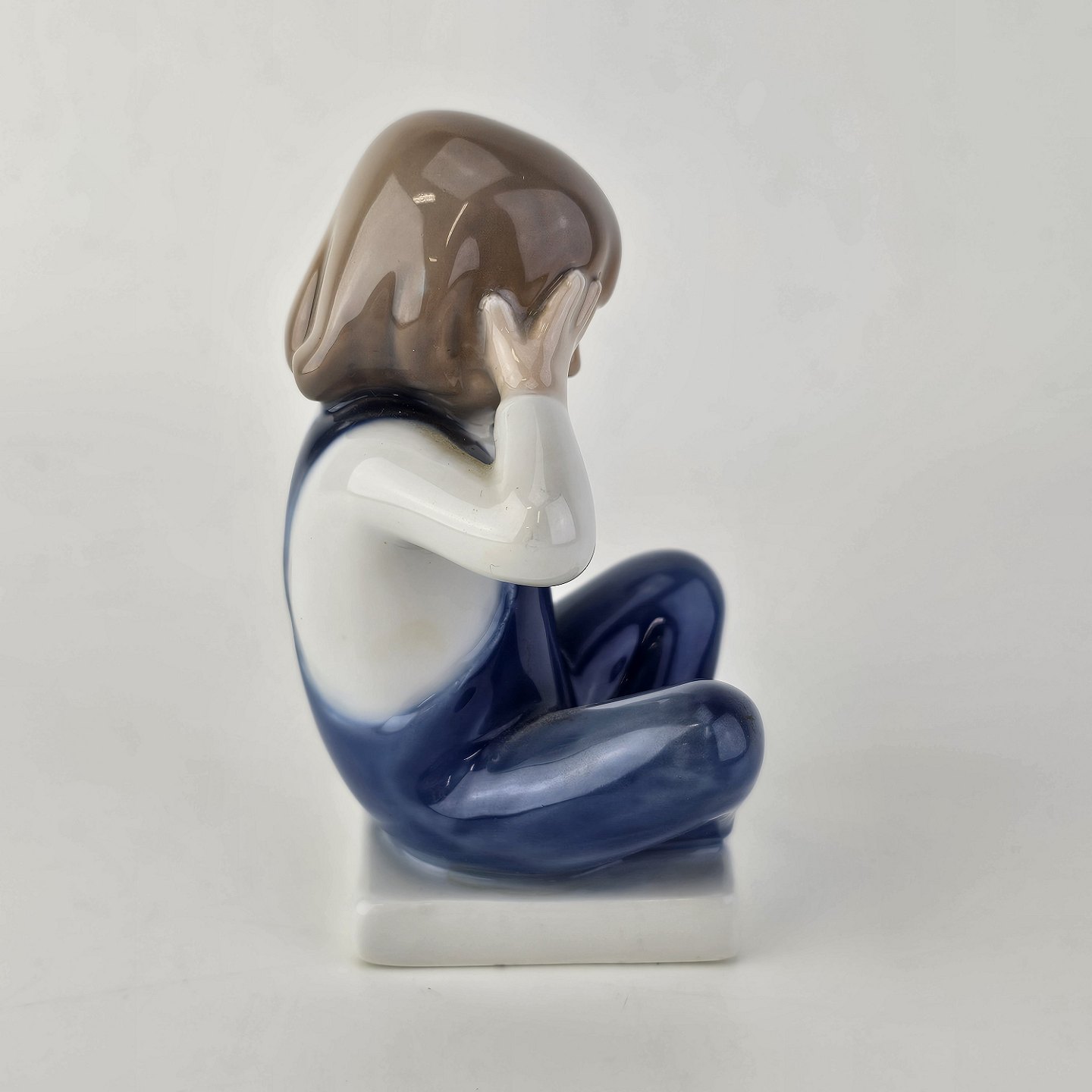 Figur i kongeligt porcelæn med motiv af en dreng som sidder med bene over kors og holder sig for øjnene