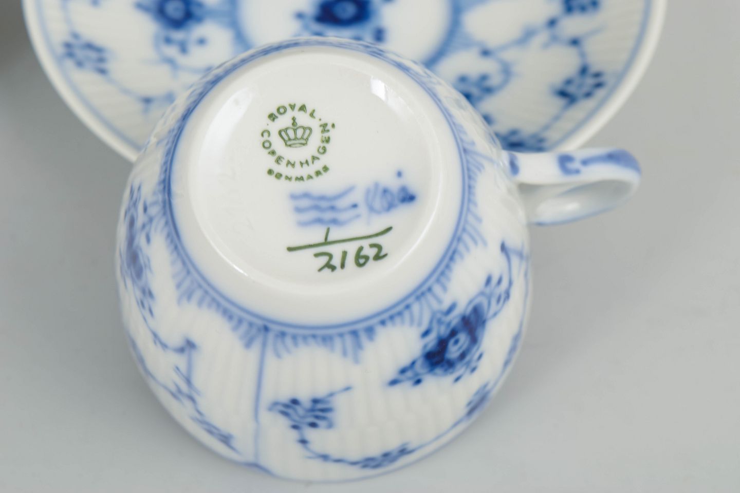 Royal Copenhagen, Musselmalet Riflet, kaffestel til 3 personer.
