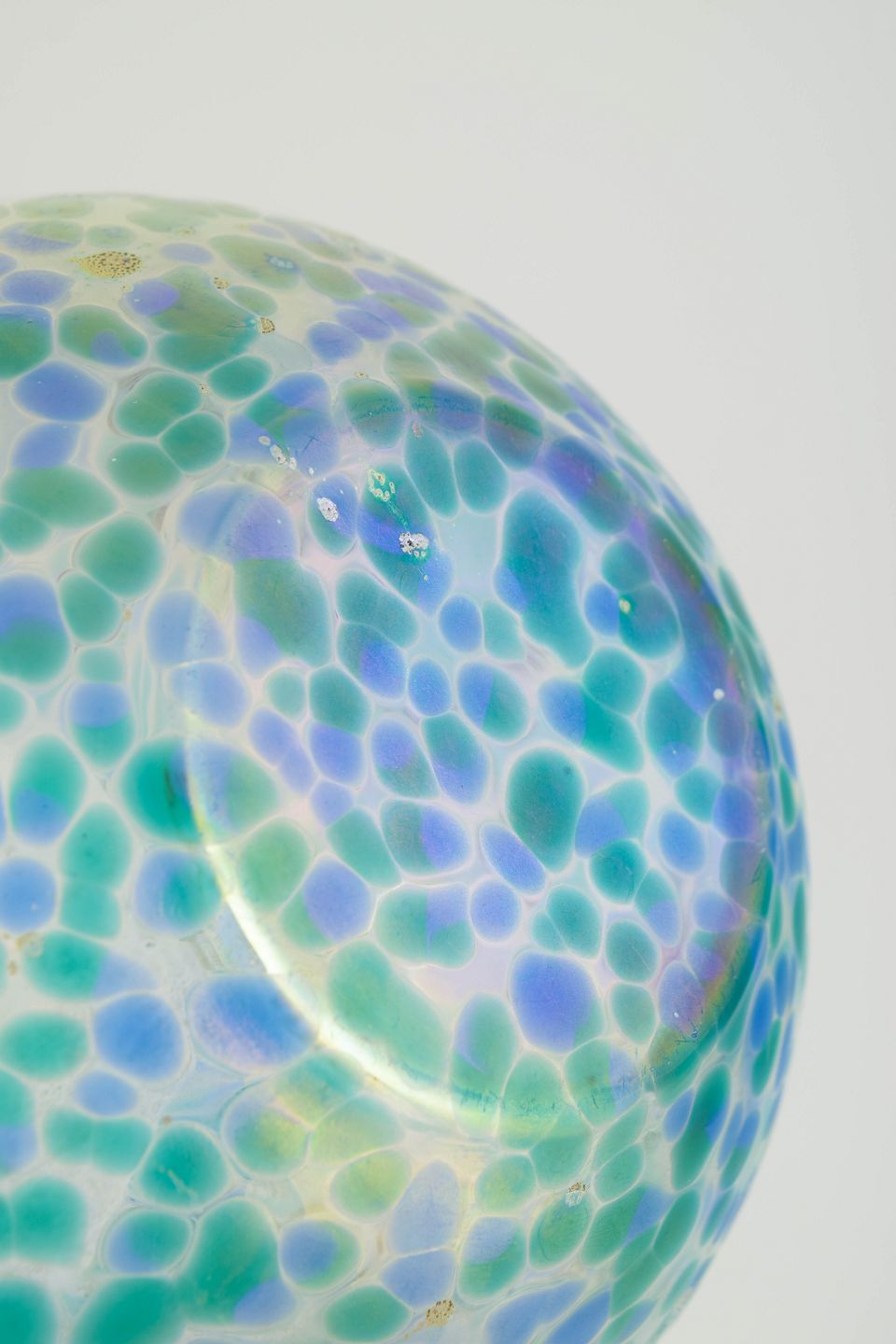 Spherical Art Nouveau art-glass vase with an iridescent surface in turquoise-blue and green tones, featuring a distinctive cellular pattern with subtle golden inclusions. The vibrant colour play and organic surface structure are characteristic of Lötz’s experimental glass production around 1900. The model appears as a sculptural object in its own right, with form and surface closely integrated.