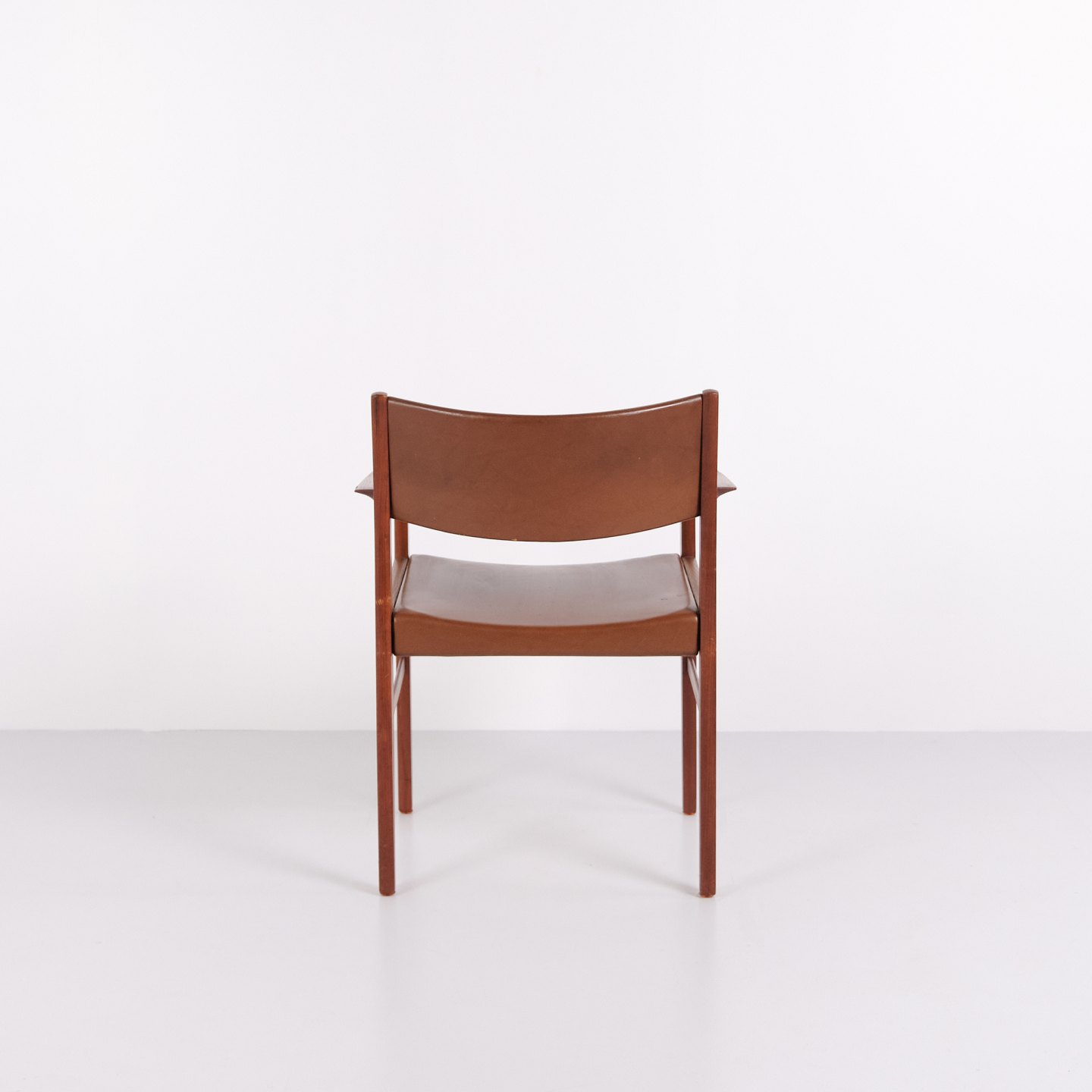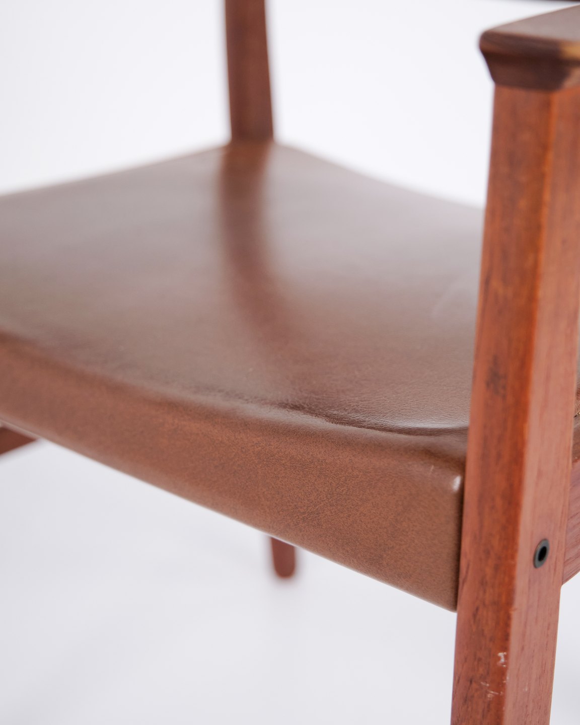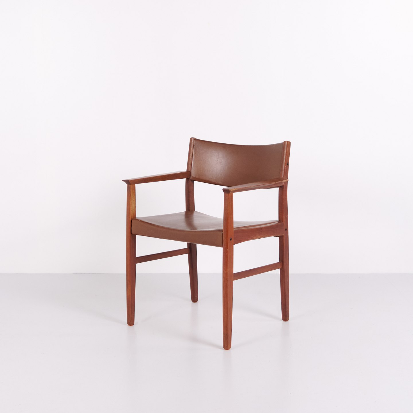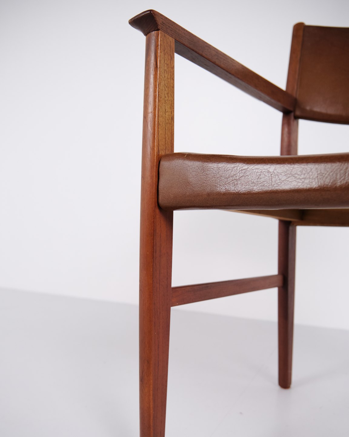 Armchair made of teak with seat and back upholstered in brown leather. The chair is representative of Danish furniture design from the 1960s, characterised by solid materials and functional construction. Suitable for use as a dining chair, desk chair or freestanding armchair.