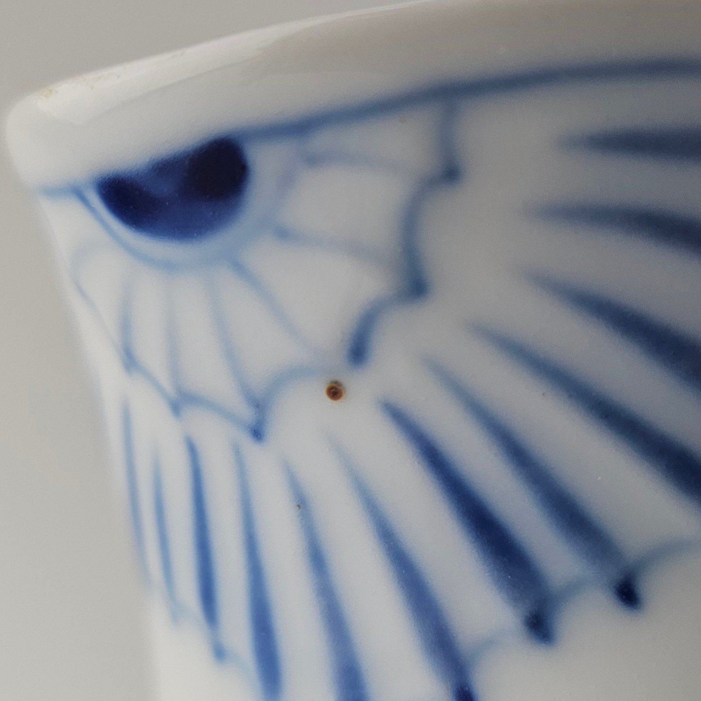 Fremstår med et slag på kanten af bunden og en plet under tuden