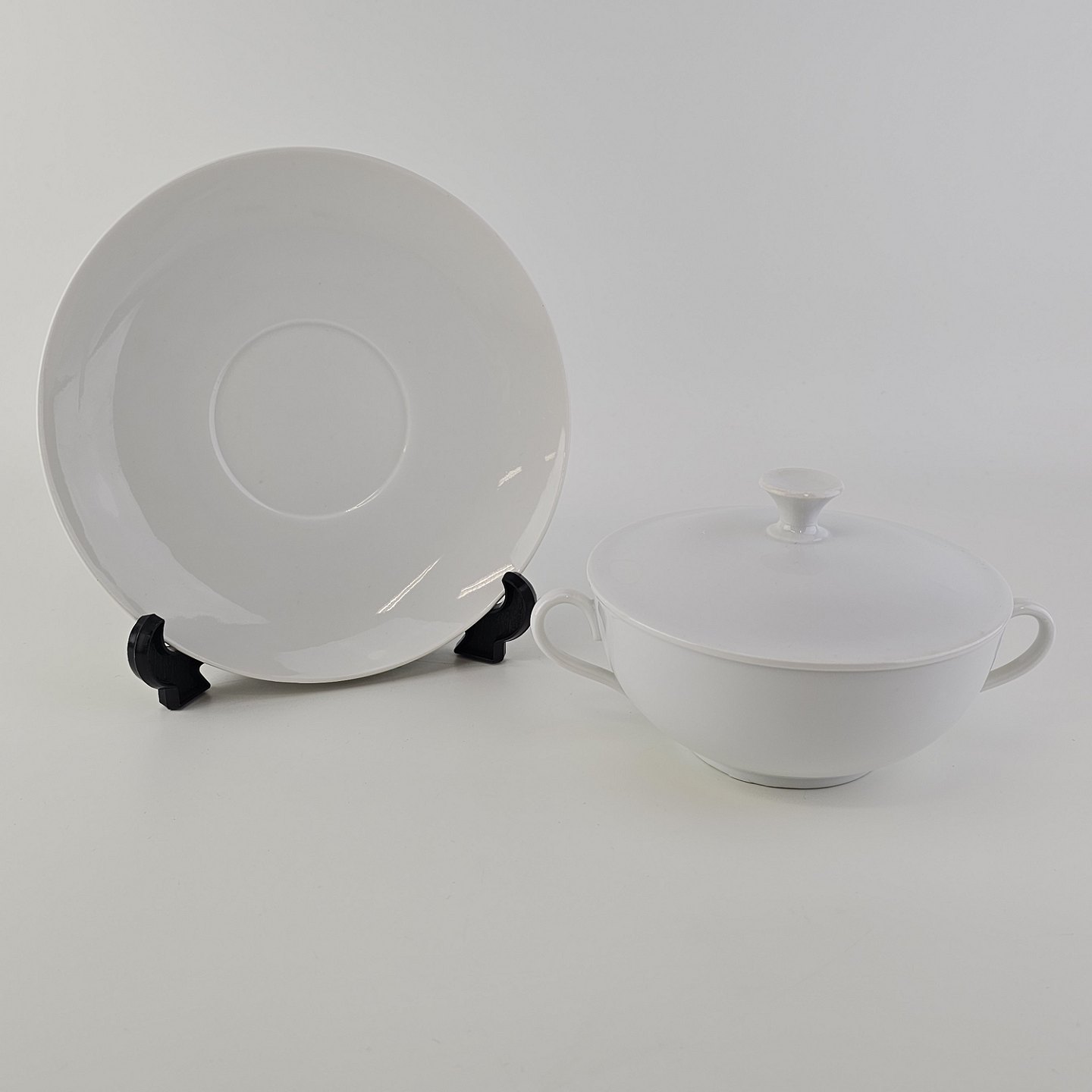 Bouillonkop med låg og underkop i glat hvidt porcelæn