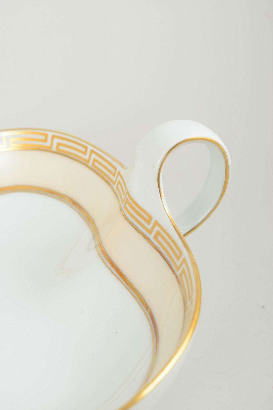 I 1920’erne fremstillede Bing & Grøndahl en række serveringsdele med et tydeligt geometrisk og stiliseret formsprog, inspireret af art deco. De karakteristiske former kombineret med forgyldt bort giver et elegant og moderne udtryk, typisk for periodens formelle borddækning.