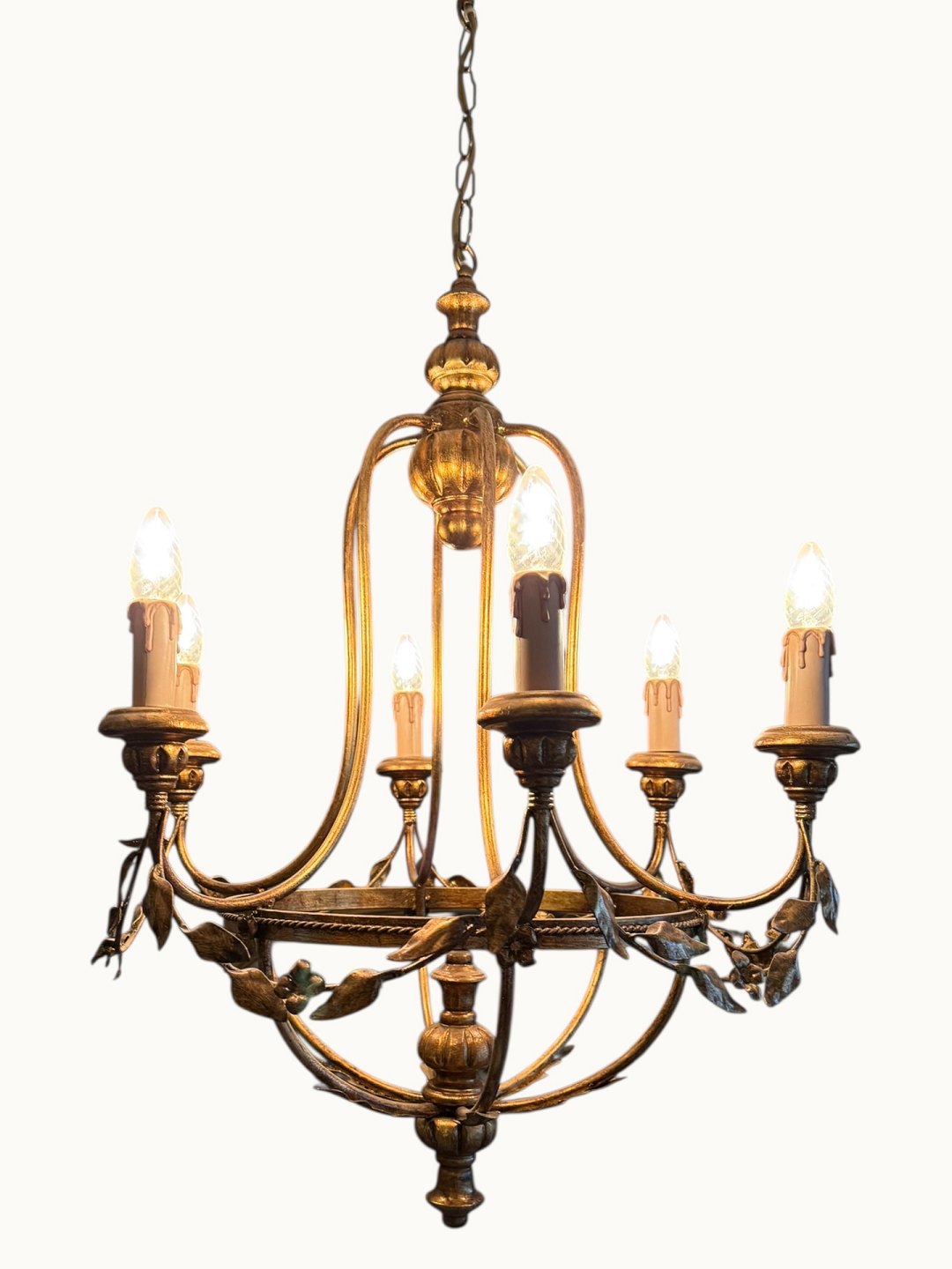 Burformet metal og træ lysekrone til elektricitet i Louis XVI stil, diameter ca. 60cm *fin og funktionsdygtig stand*