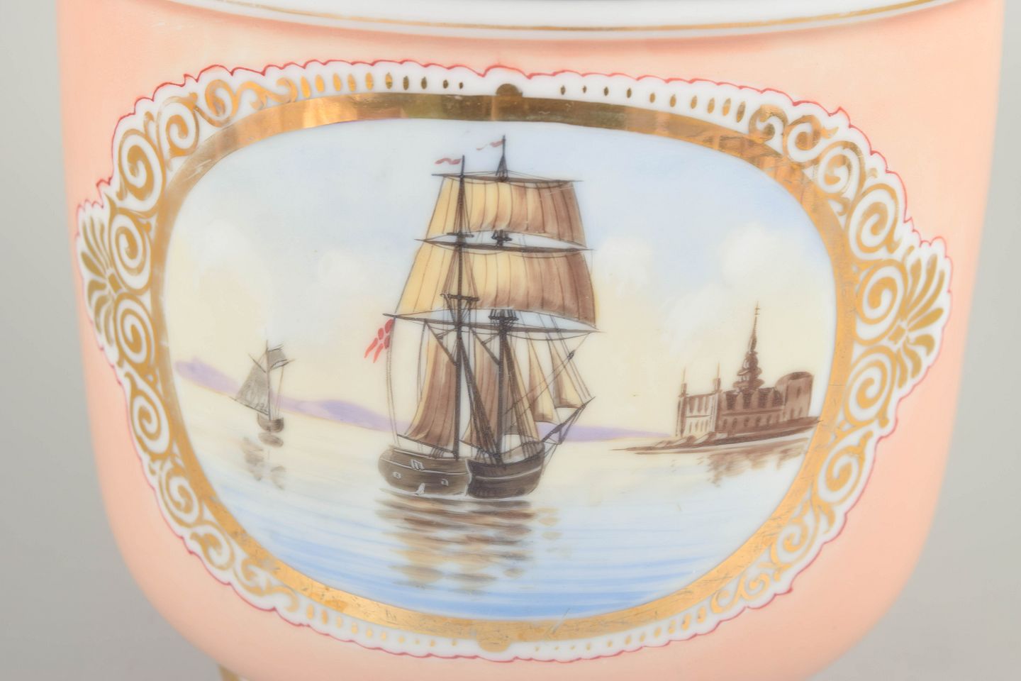 Rund, let konisk vase i porcelæn med opaliserende rosa bundfarve og håndmalet prospekt af Bernstorff Slot og Kronborg slot i parklandskab med høje træer i forgrunden, indrammet af et ornamenteret felt og forgyldt bort langs randen. Klassicistisk inspireret form med lav fodring. Motivet er udført i bløde grønne og jordfarver med let idealiseret arkitektonisk gengivelse.