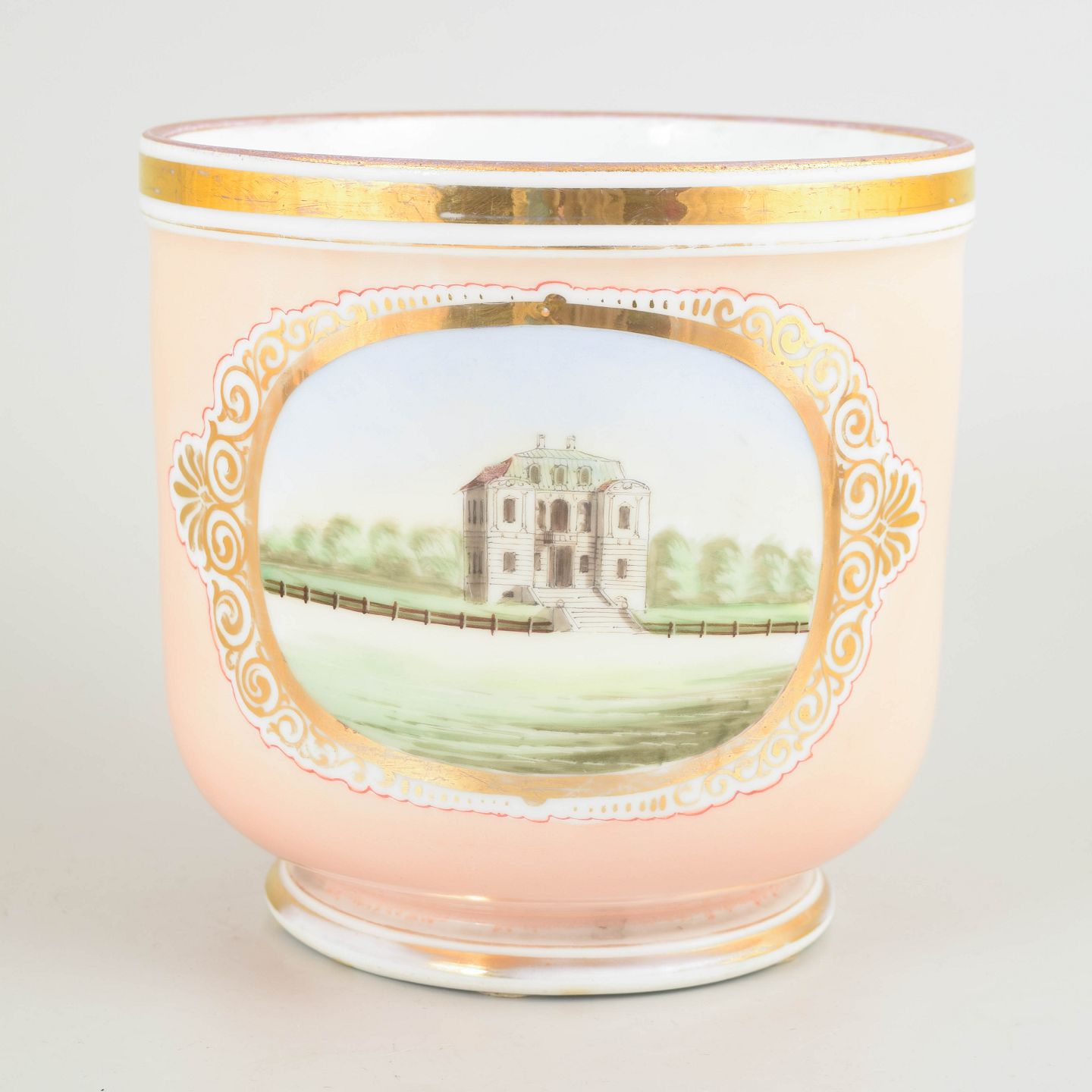 Rund, let konisk vase i porcelæn med opaliserende rosa bundfarve og håndmalet prospekt af Erimitageslottet & Kronborg Slot i et ornamenteret felt med forgyldt bort langs randen. Klassicistisk inspireret form med lav fodring. Motiv udført i fine pastelfarver med arkitektoniske detaljer.