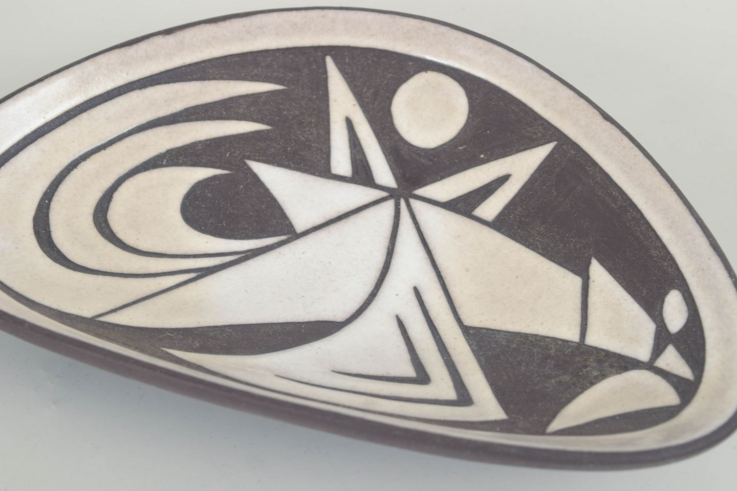 Trekantet skål/fad i stentøj med flad profil og grafisk, abstrakt dekoration i sort på hvid bund. Dekoren har et stramt, modernistisk udtryk med kontrastflader og stiliserede former. Model 5516, stemplet under bunden.