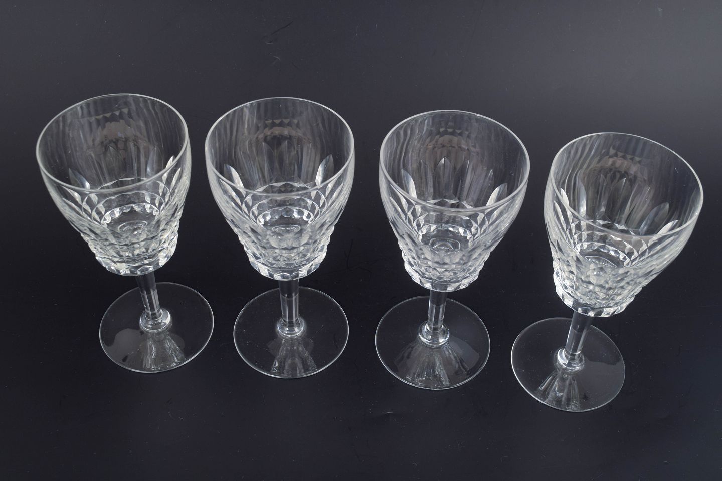 Sæt med fire franske rødvinsglas i klart krystal med facetteret kumme og klassisk stamme. Form og slibning giver et elegant lysspil og et tidstypisk udtryk fra midten af det 20. århundrede.