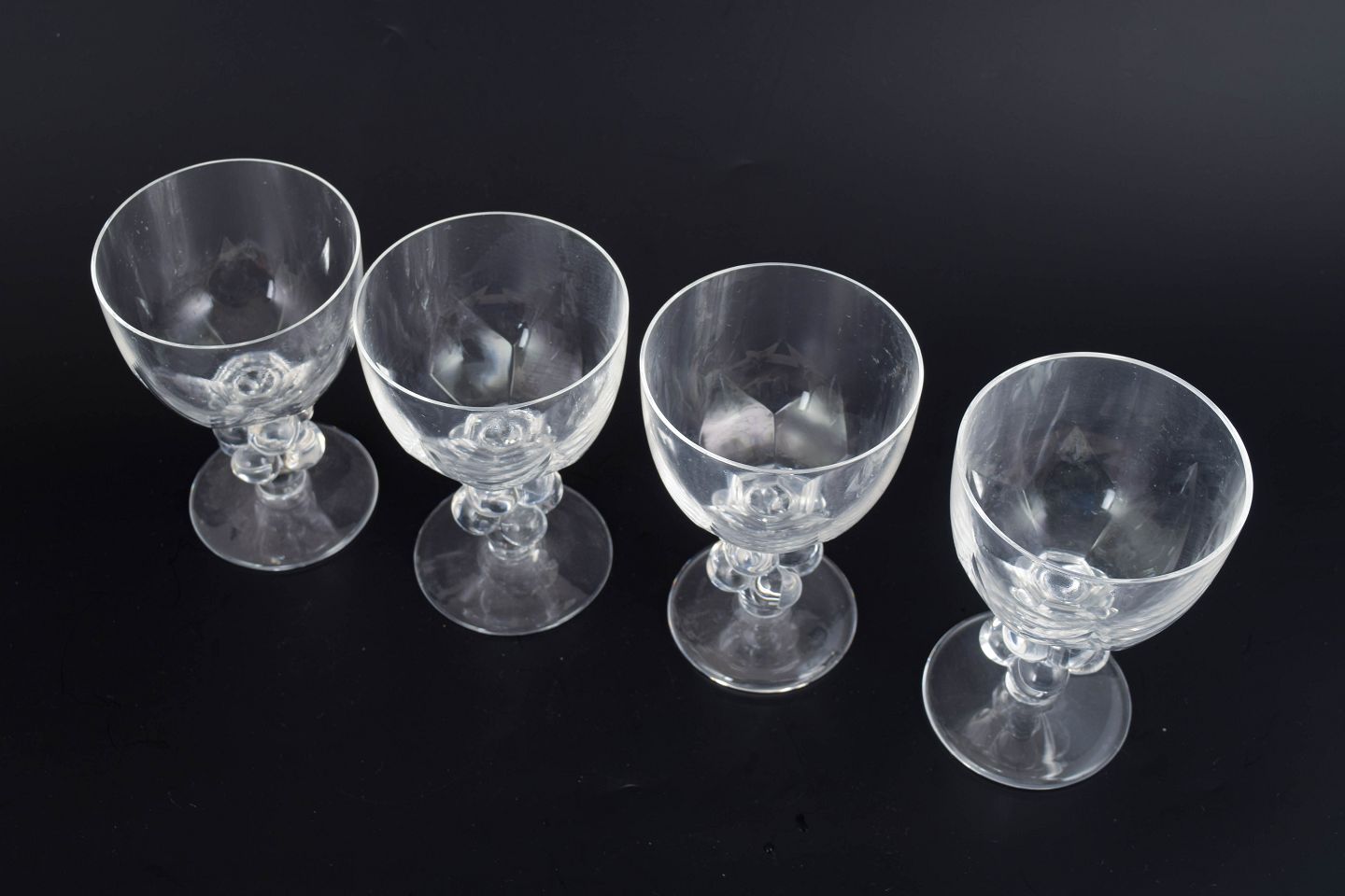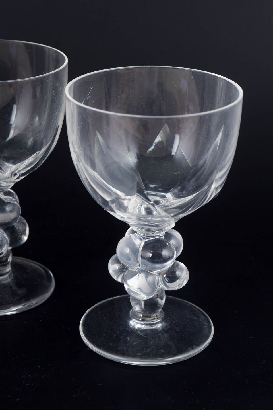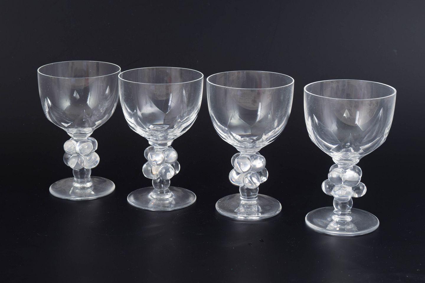Sæt med fire store og sjældne vinglas i klart formpresset glas med facetslebet kumme og stilk udformet som drueklase. Modellen “Clos Vougeot” er udført med elegant Art Deco-inspireret symmetri, hvor de dekorative former både har en skulpturel og funktionel karakter. Glassene er signeret i bunden.