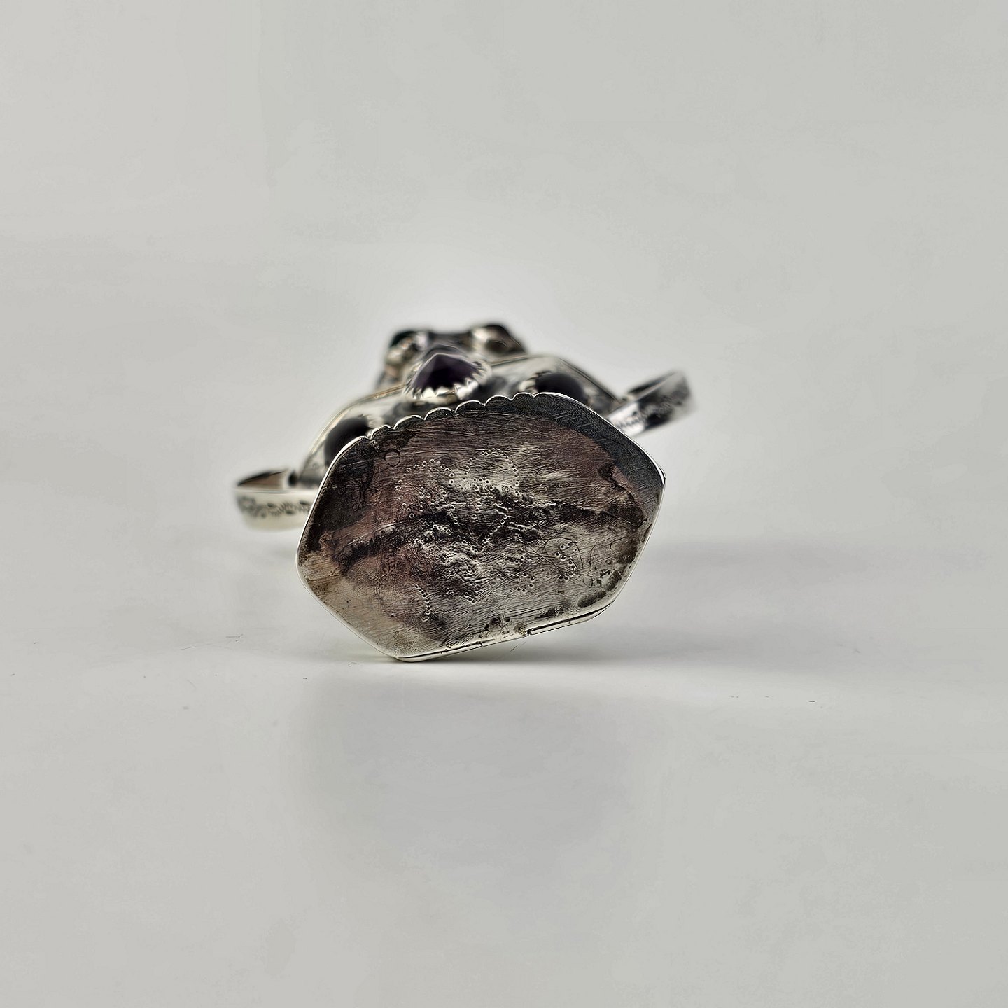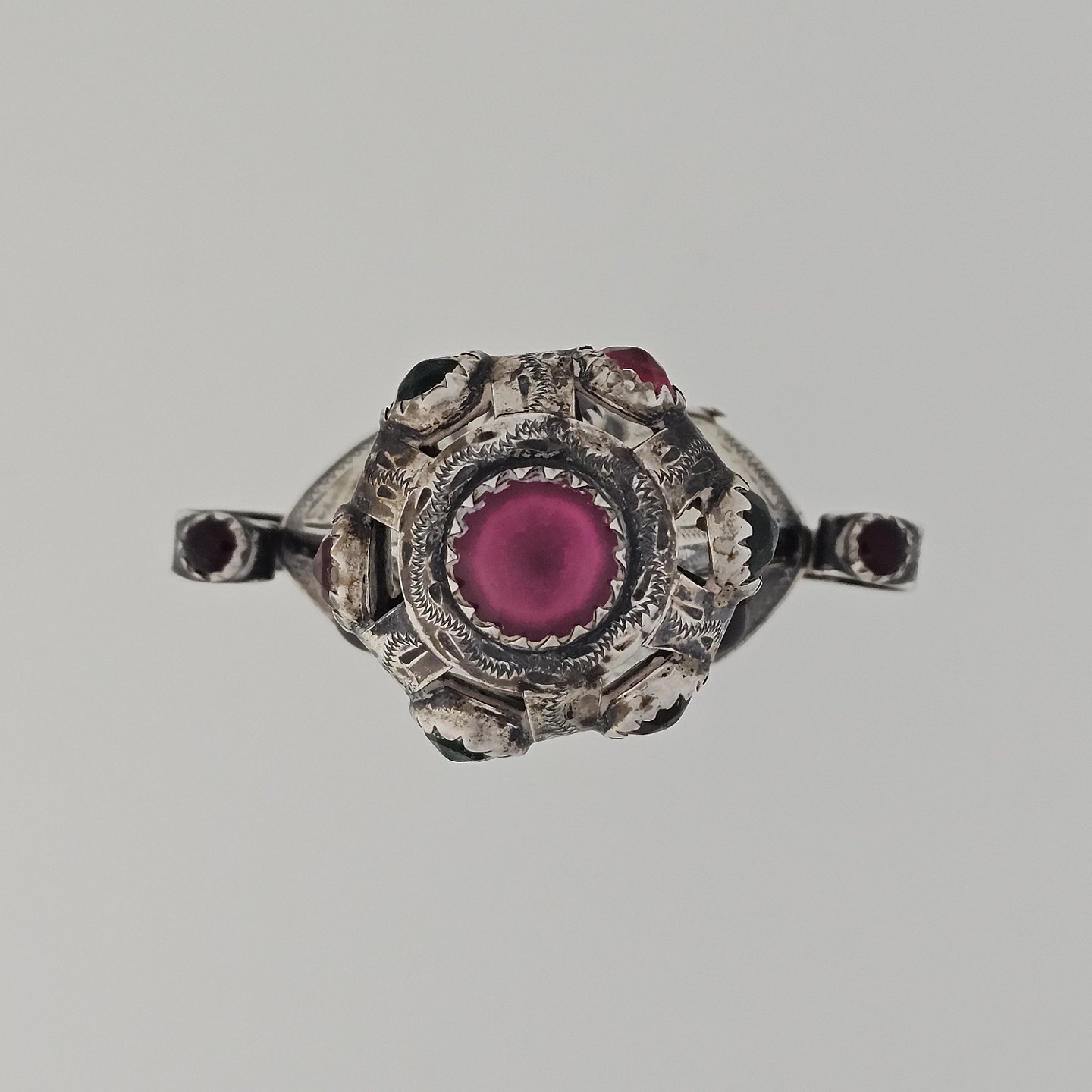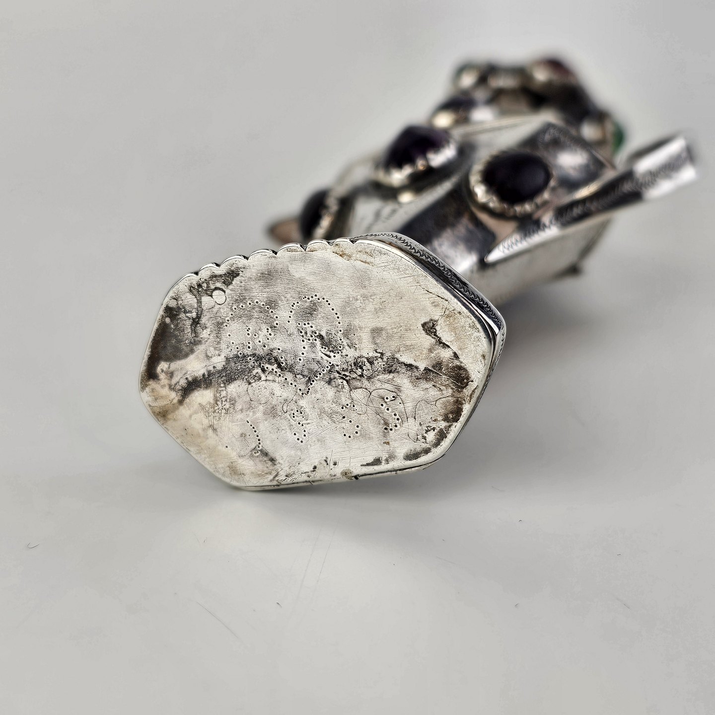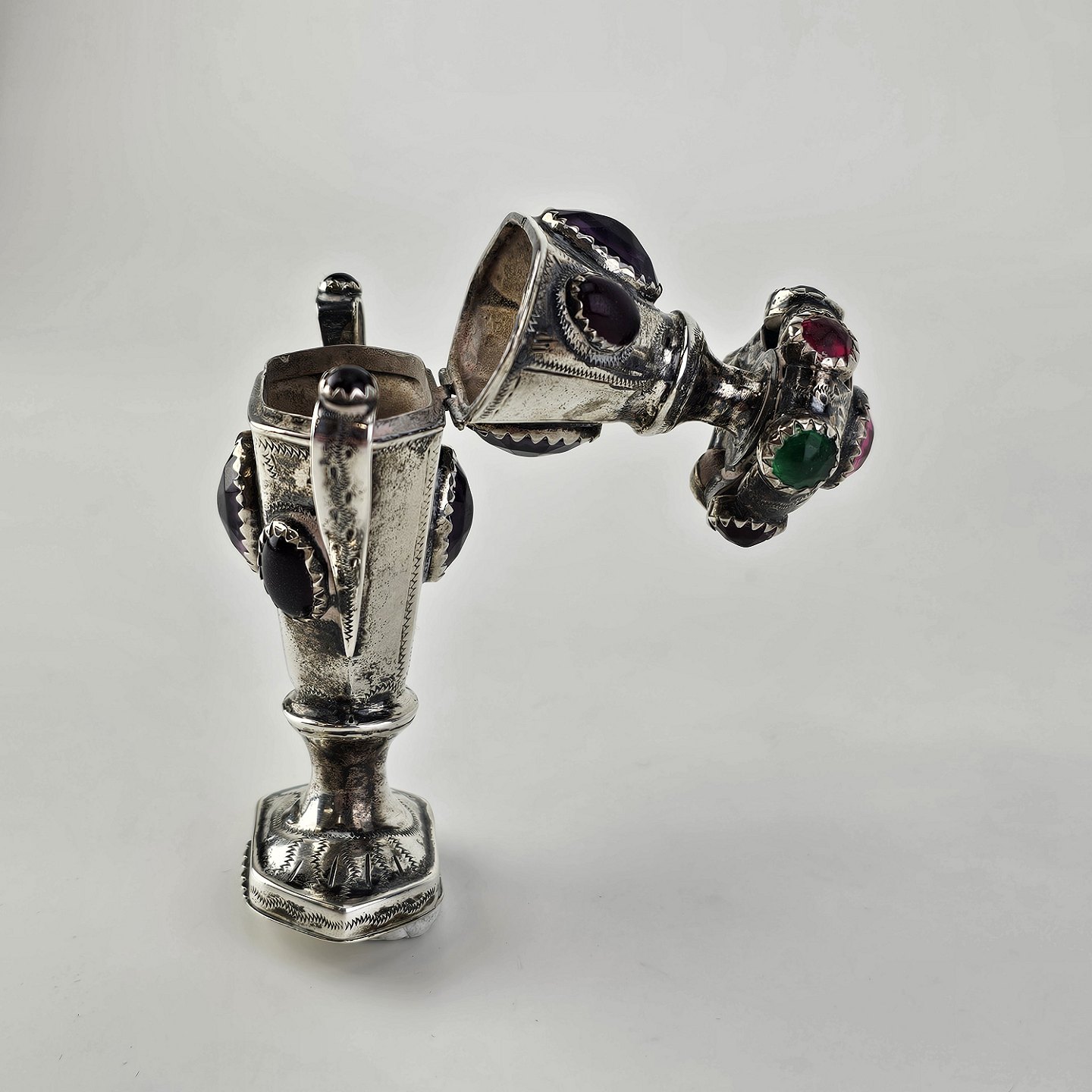 Hovedvandsæg i sølv dekoreret med forskellige smykkesten. Indgraveret under bunden med et hjerte, initialer og årstallet 1955