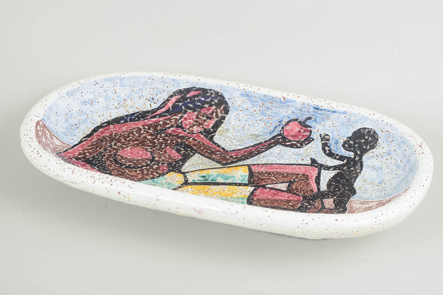 Unikt figurativt vægrelief i glaseret stentøj med stiliseret mor- og barnemotiv udført i kraftige jordfarver og kontrasterende konturtegning.