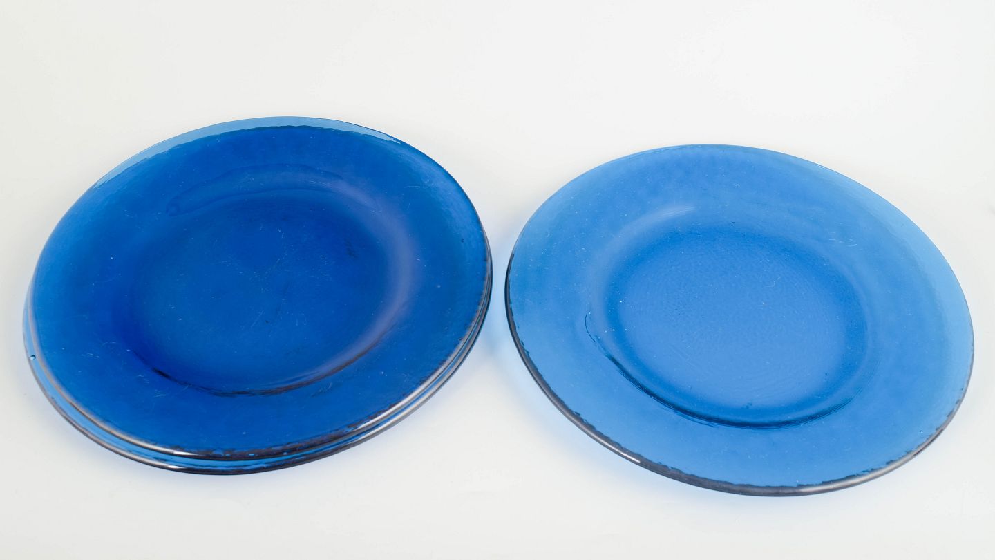 Sæt med tre svenske tallerkener i kraftigt blæst kunstglas i blå nuancer, udført med glat spejl og let ujævn rand, typisk for skandinavisk glasdesign fra midten af det 20. århundrede.