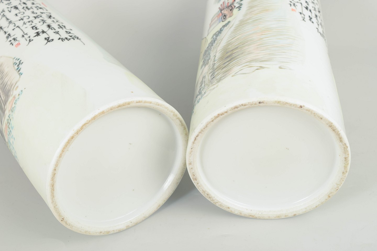 Par cylindriske vaser i porcelæn, hånddekoreret med figurscener i emaljefarver samt kalligrafi og segl. Den kalligrafiske tekst kan oversættes til: “Blomsternes duft er ren og vidtrækkende; de elegante blomster afspejler en forfinet smag og udtrykker ro, harmoni og samklang mellem natur og menneske.”