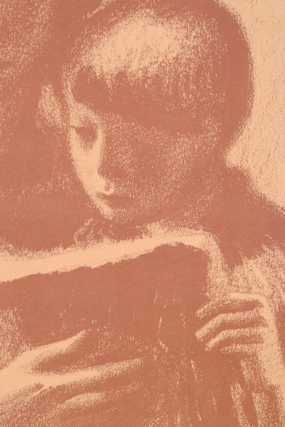 Figurativ fremstilling med moder og barn, udført i et blødt, stemningsfuldt grafisk udtryk med tydelig social og humanistisk karakter. Signeret og dateret 1949.