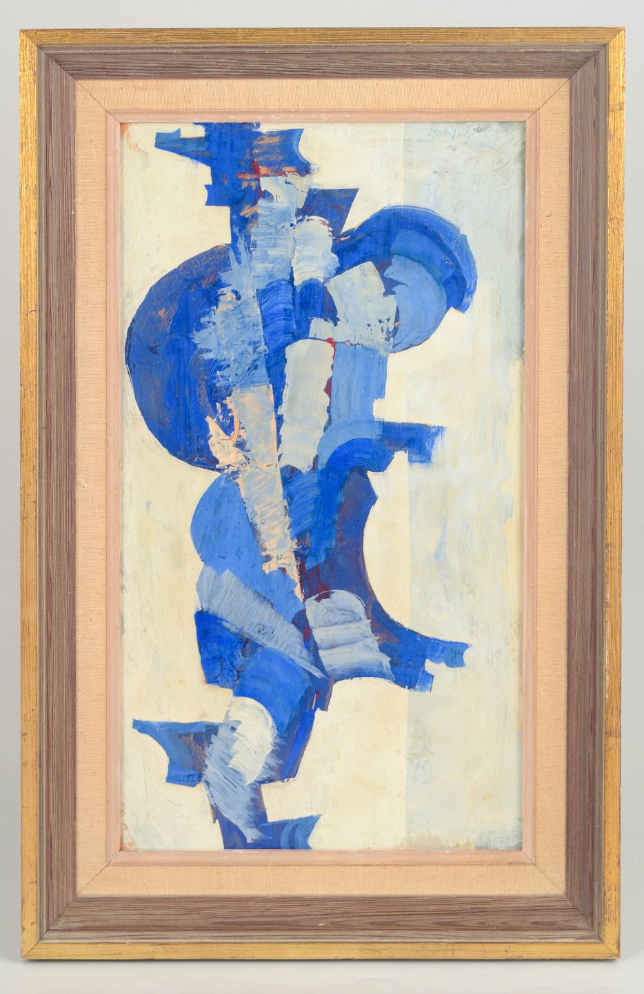 Abstrakt, modernistisk komposition udført i olie på plade med dynamiske, lagdelte penselstrøg i blå og hvide nuancer, signeret og indrammet.
