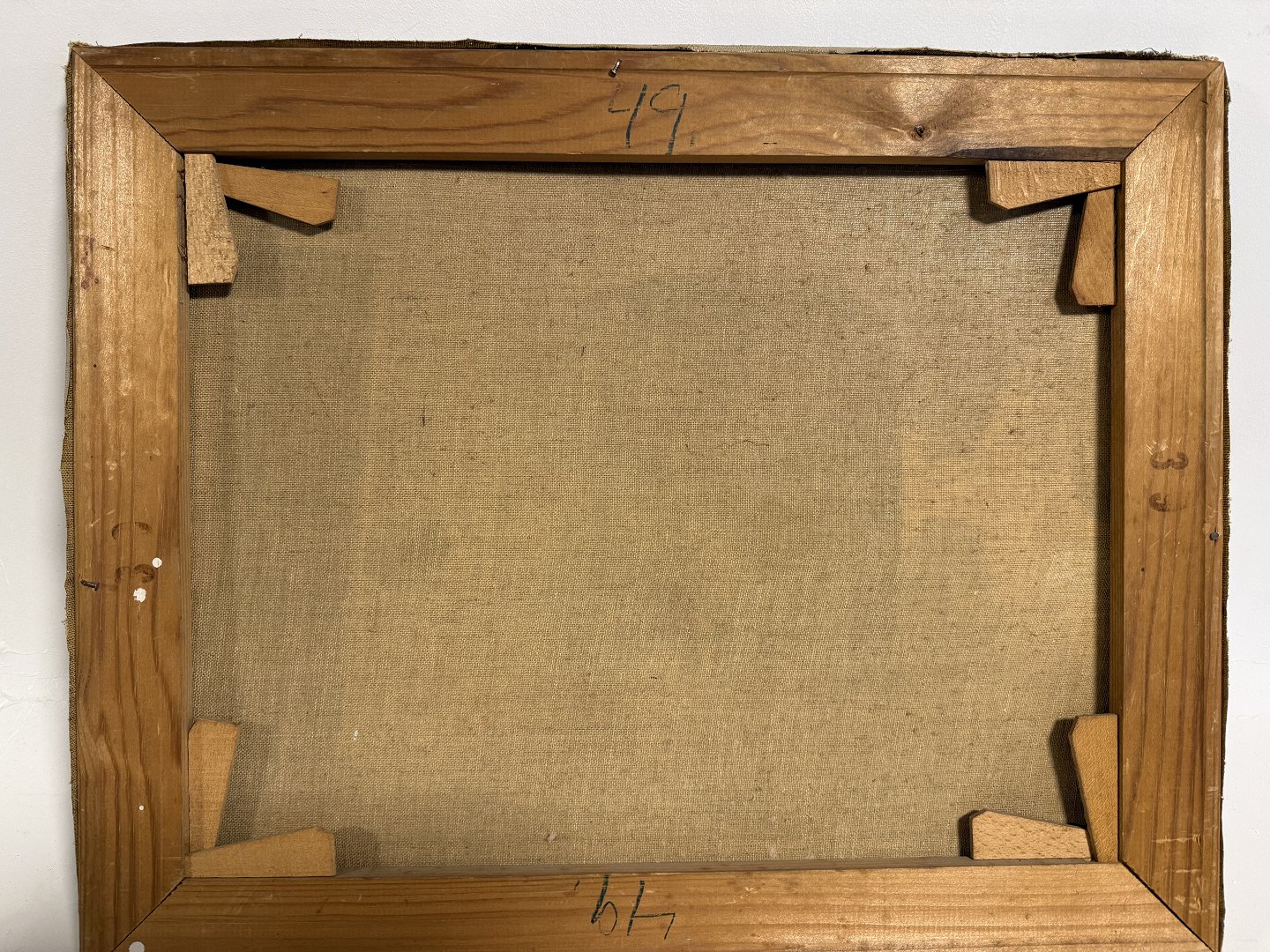 Osvald Rasmussen (1885-1972), Uindrammet maleri på lærred af interiører med ildsted / køkken fra 1747, signeret Osv Rasmussen, Mål 49x39cm.