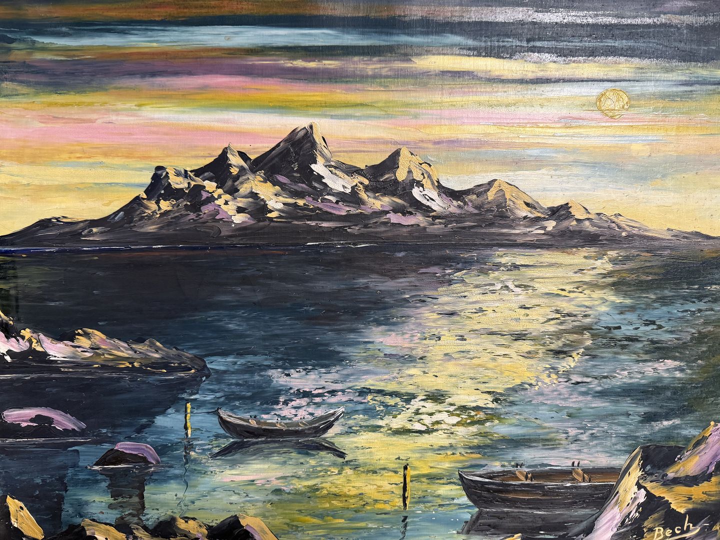 Bech Vogt-Sørensen (1919-?), Oliemaleri på lærred af hav og ø i måneskin, signeret Bech, Mål med ramme: 56,5x47,5cm