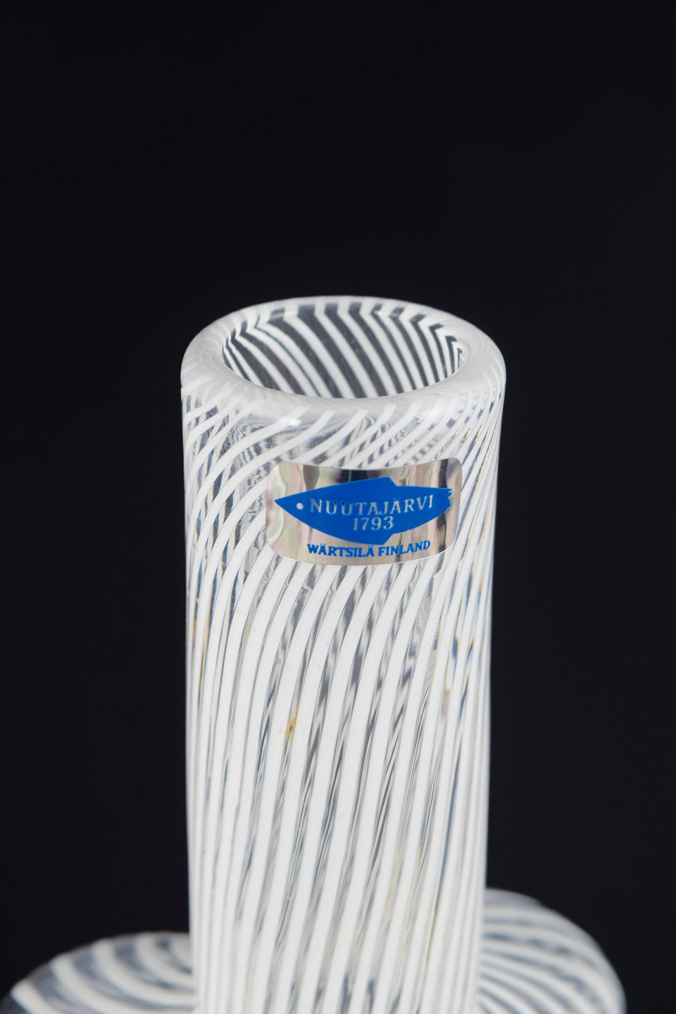 Slank flaskeformet vase i klart kunstglas med indlagt hvid spiral- og trådmønster udført i lagdelt teknik. Modellen er mundblæst og fremstår med original Nuutajärvi 1793 Wärtsilä Finland-klistermærke samt signering. Formen og den optiske dekoration er karakteristisk for finsk kunstglas fra 1970’erne.