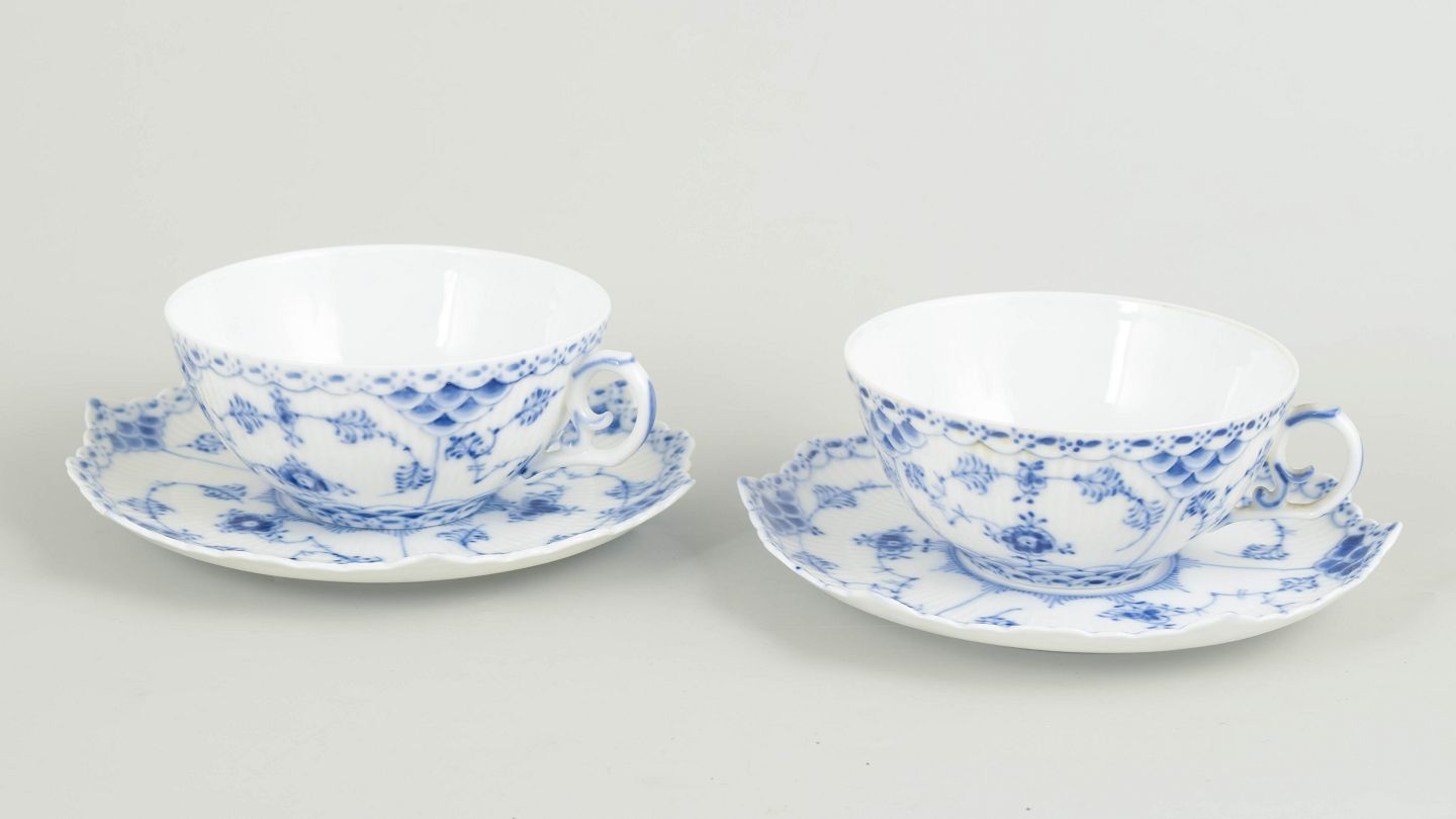 To tekopper med matchende underkopper i håndmalet underglasurblå dekoration i Musselmalet helblonde, med gennembrudt blondedekoration langs kant. Kop og underkop model 1/1130. Annulleret med én og to indridsede streger.
