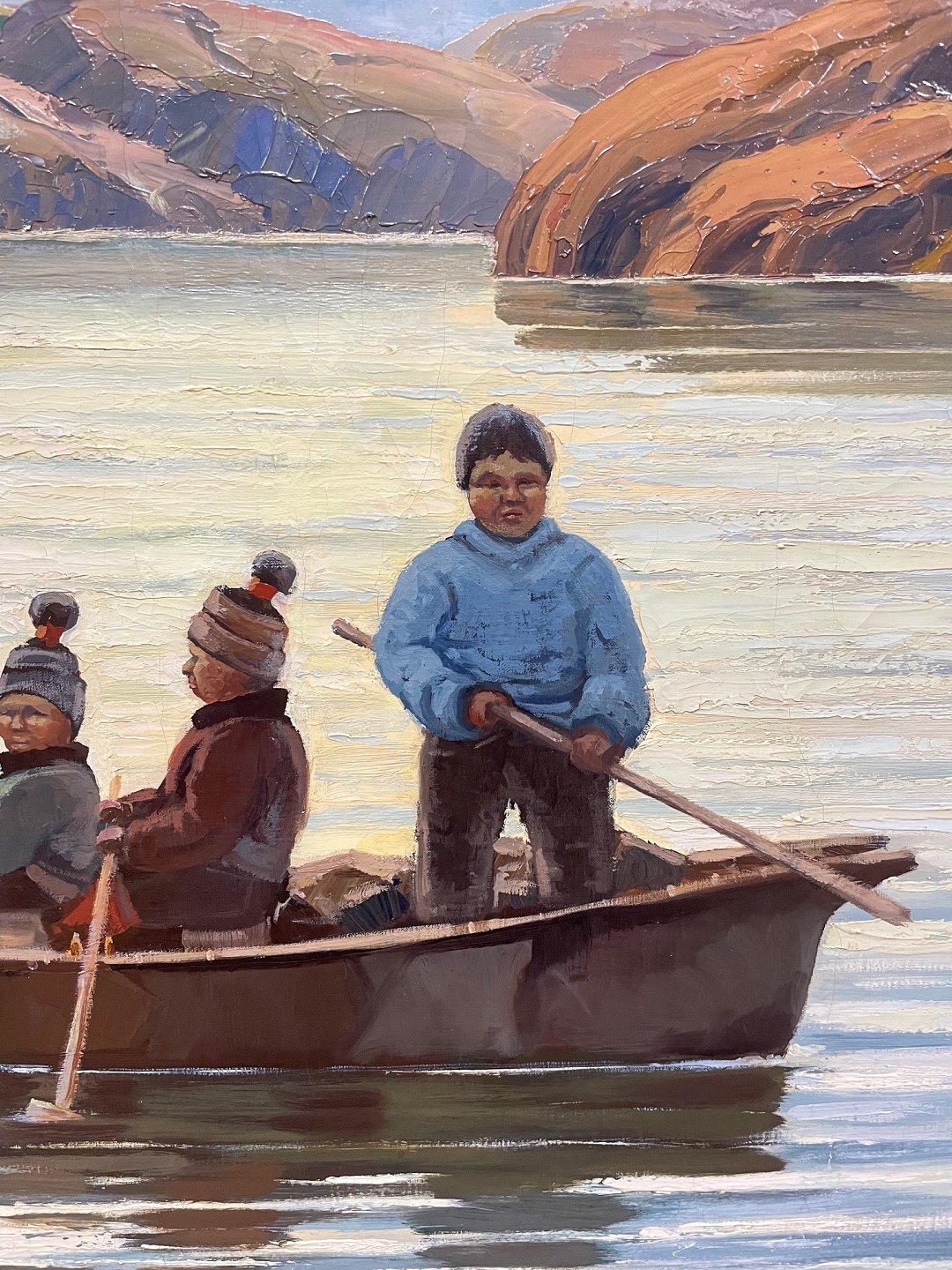 Stort flot maleri fra Grønland. Maleriet er monteret i forgyldt ramme. Maleriet har krakeleringer men ellers i god stand, er netop blevet renset hos konservator.