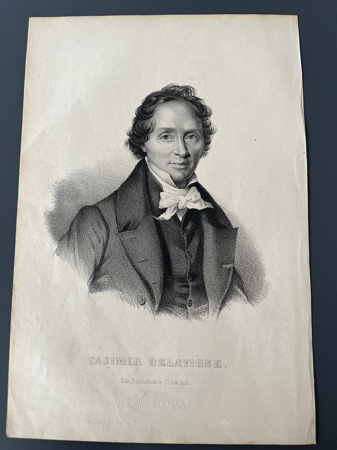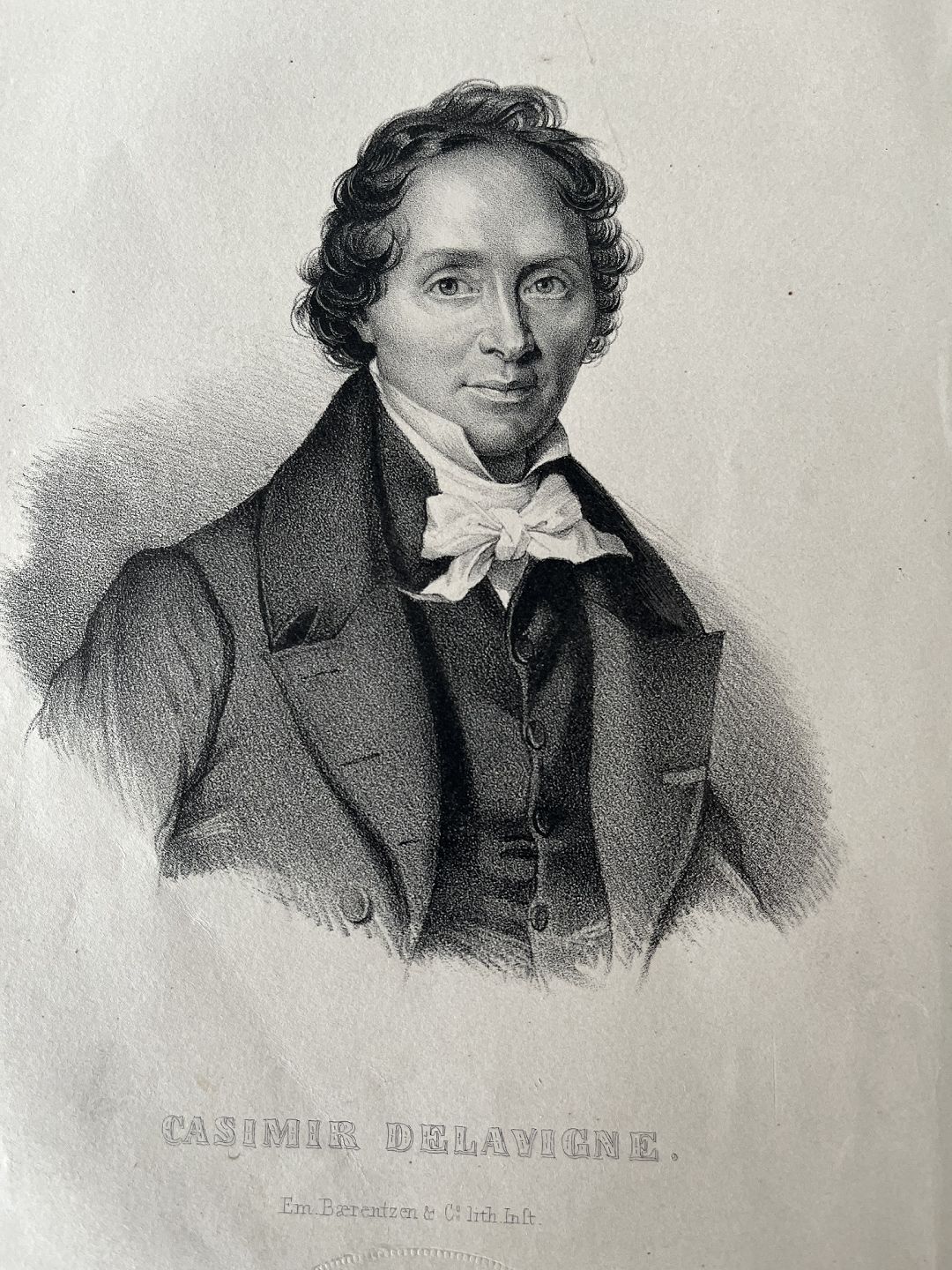 Litografi af Em. Bærentzen - Portræt af den franske digter Casimir Delavigne.