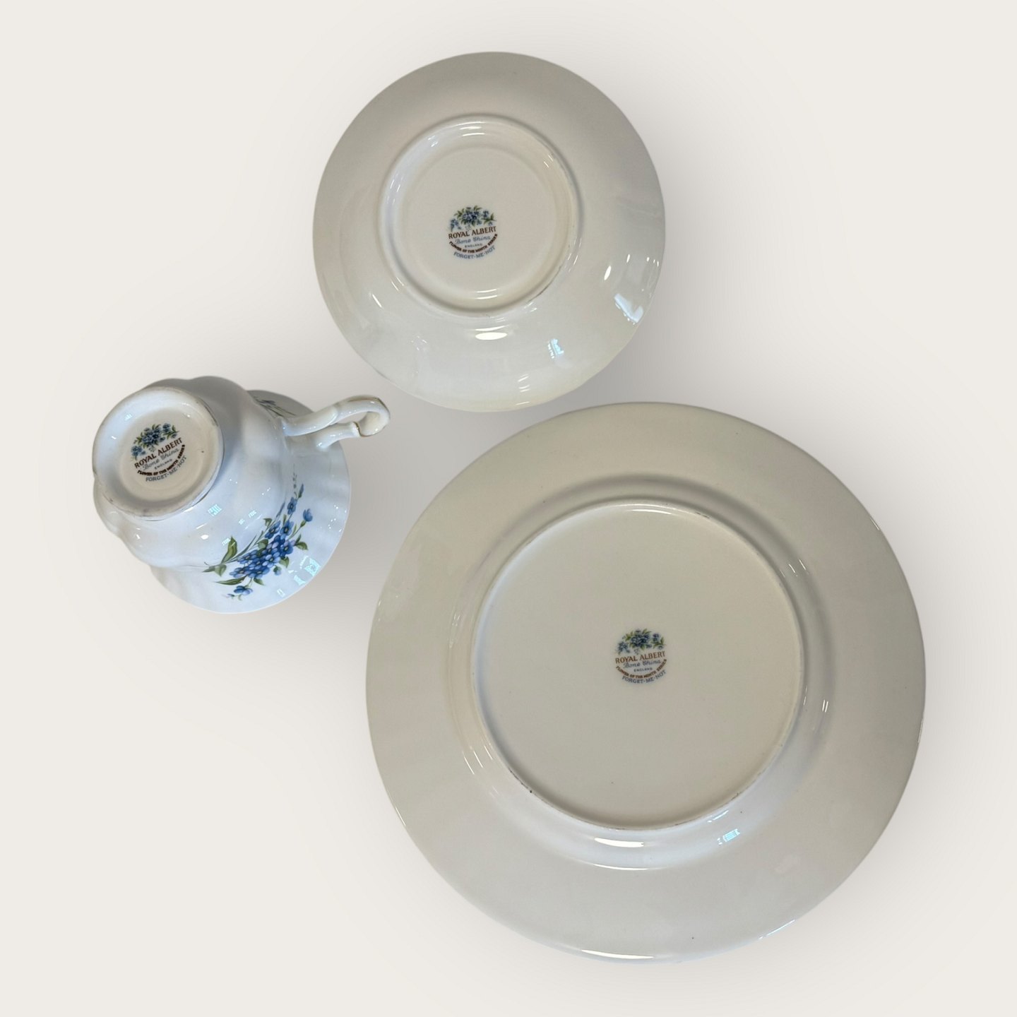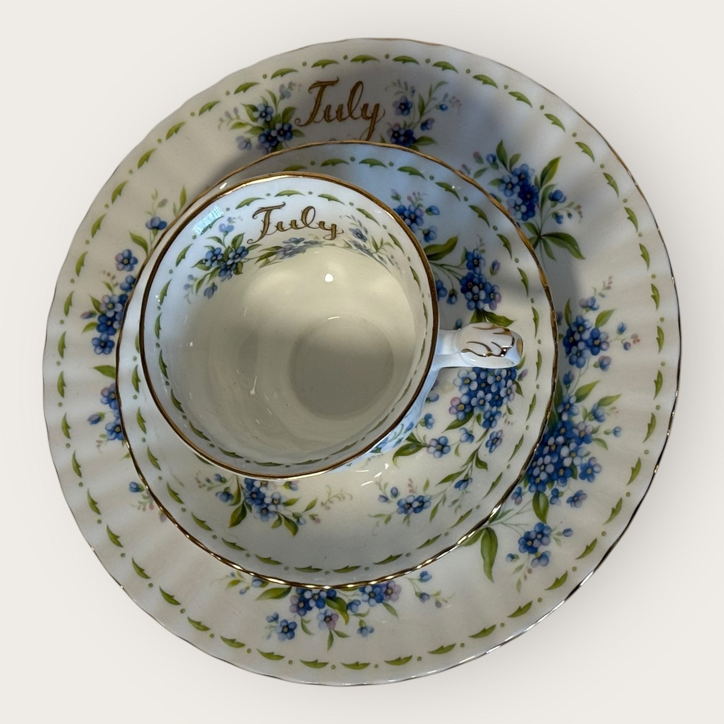 Royal Albert, Flower of the month, Trio sæt med kop, underkop og kagetallerken, tallerken har diameter 20,5cm, koppen har diameter 9cm og højde 7cm *Fremstår i perfekt stand*
