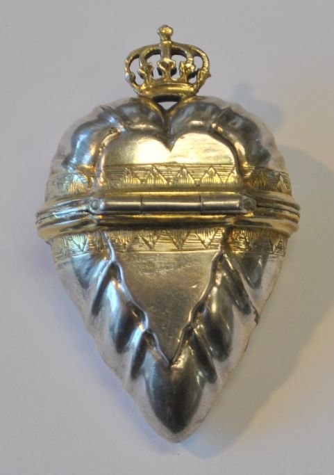 Thomas Andreas Westrup (ca. 1727 - 1814) København, Danmark: Hjerteformet hovedvandsæg med krone. På standfod. Indvendig lueforgyldt. Stemplet indvendig i låg. Udvednig med forgyldninger og graveringer, Med indgravering: G. J. D. Højde: 7 cm.