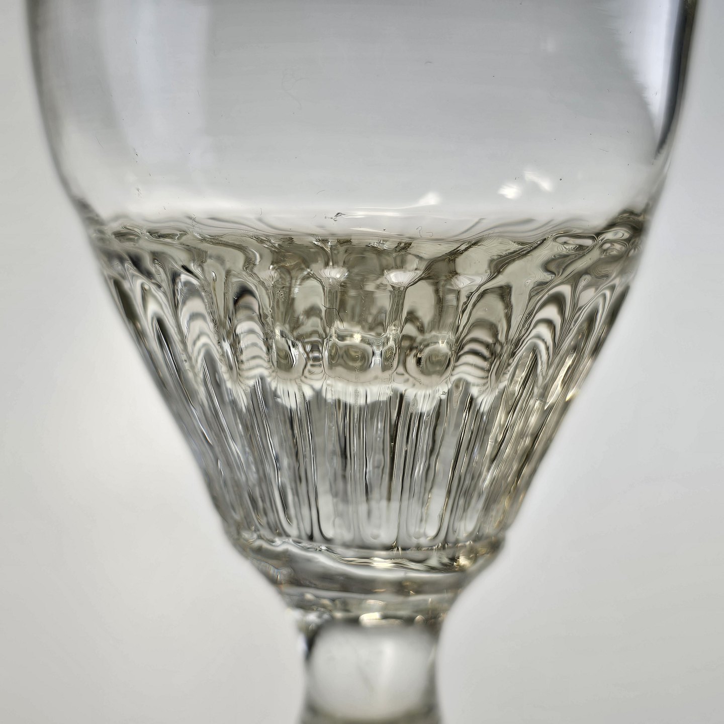 Håndblæst vinglas med riflet, tøndeformet kumme på stilk med knap