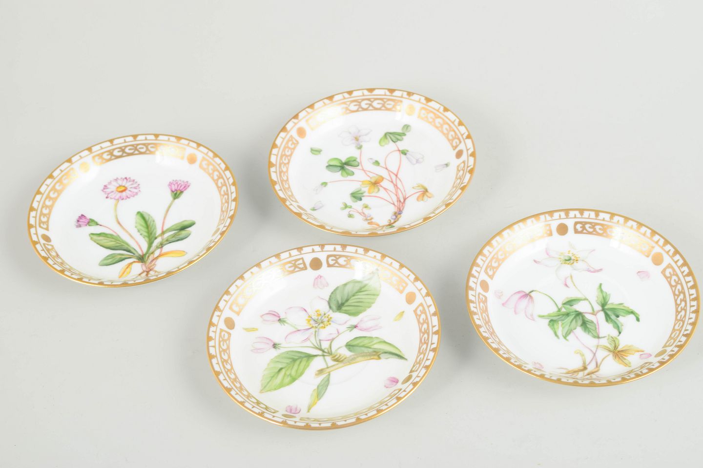 Porcelæn i Flora Danica-stil med håndmalede botaniske motiver og forgyldt kant.
