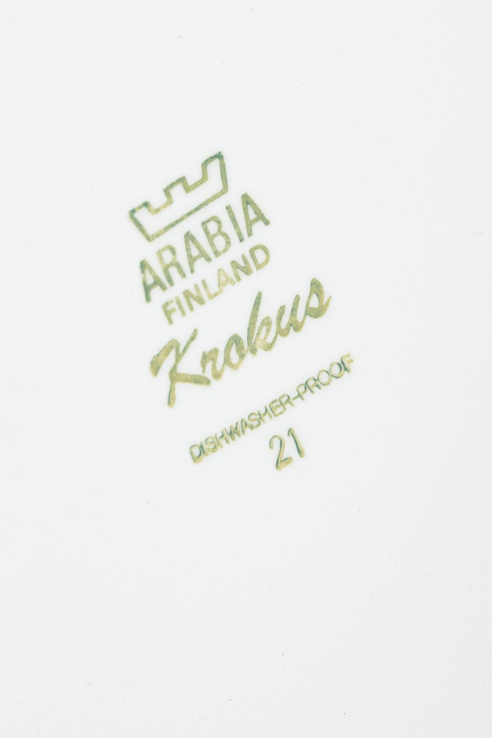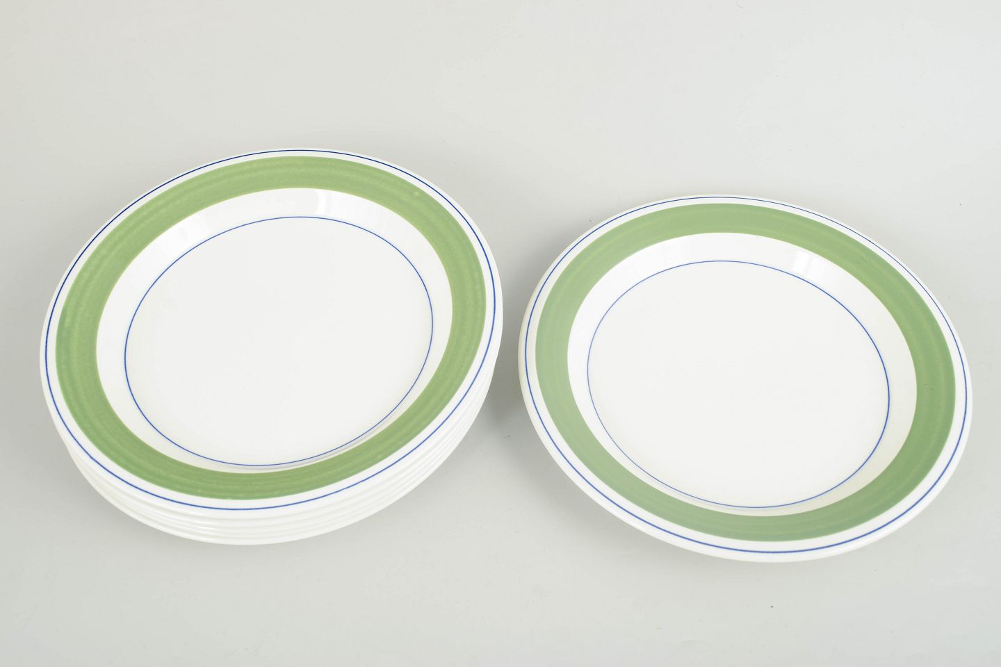 Sæt med 6 middagstallerkener dekoreret med det karakteristiske “Krokus”-mønster i grønne nuancer med fine blå cirkellinjer placeret langs fanen.
