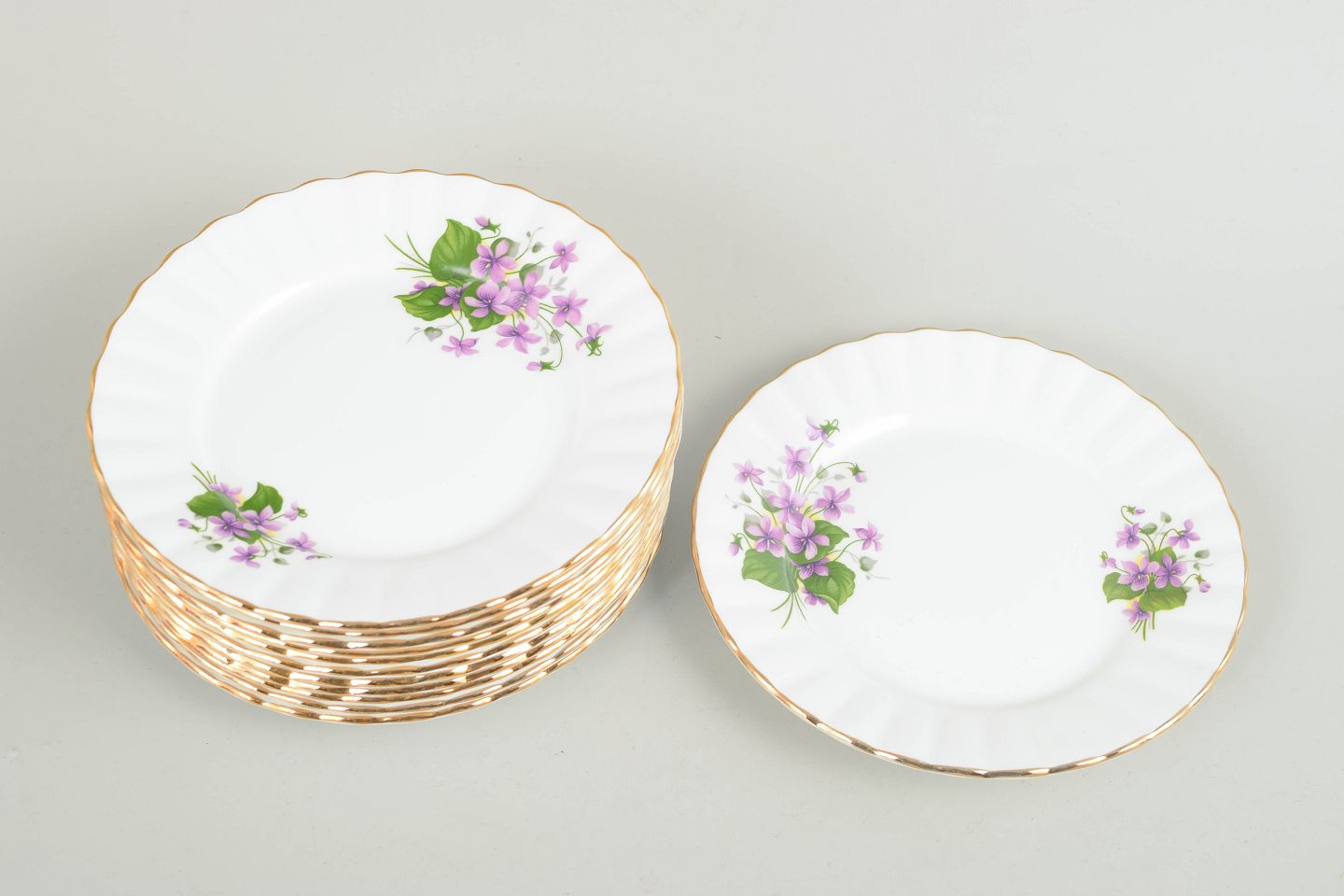 Sæt med tolv kagetallerkener i "bone china", dekoreret med fine lilla blomsterbuketter og forgyldt kant. Klassisk engelsk porcelæn med let relief og elegant, tidstypisk udtryk.