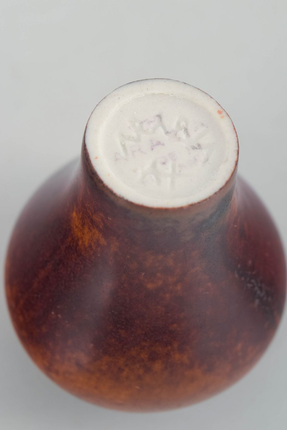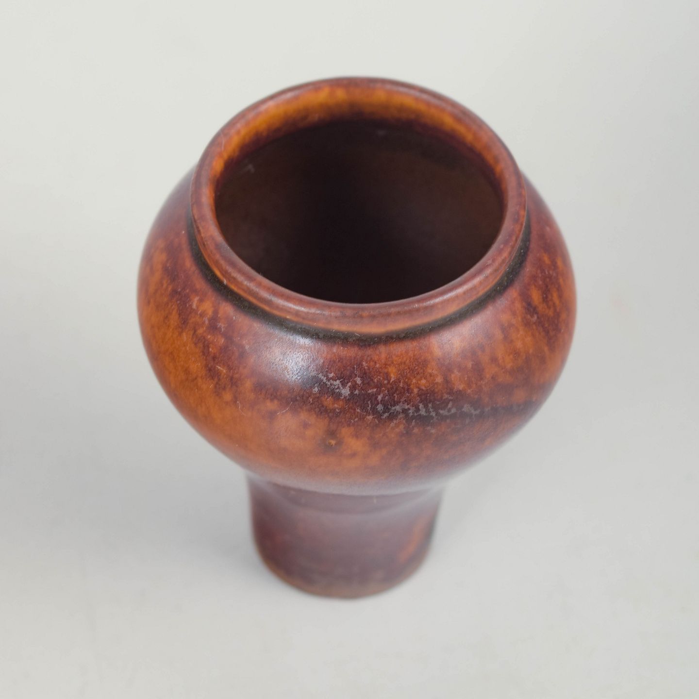 Lille hånddrejet miniaturevase i stentøj med varm brunlig glasur med let nuanceret overflade. Signeret i bunden.