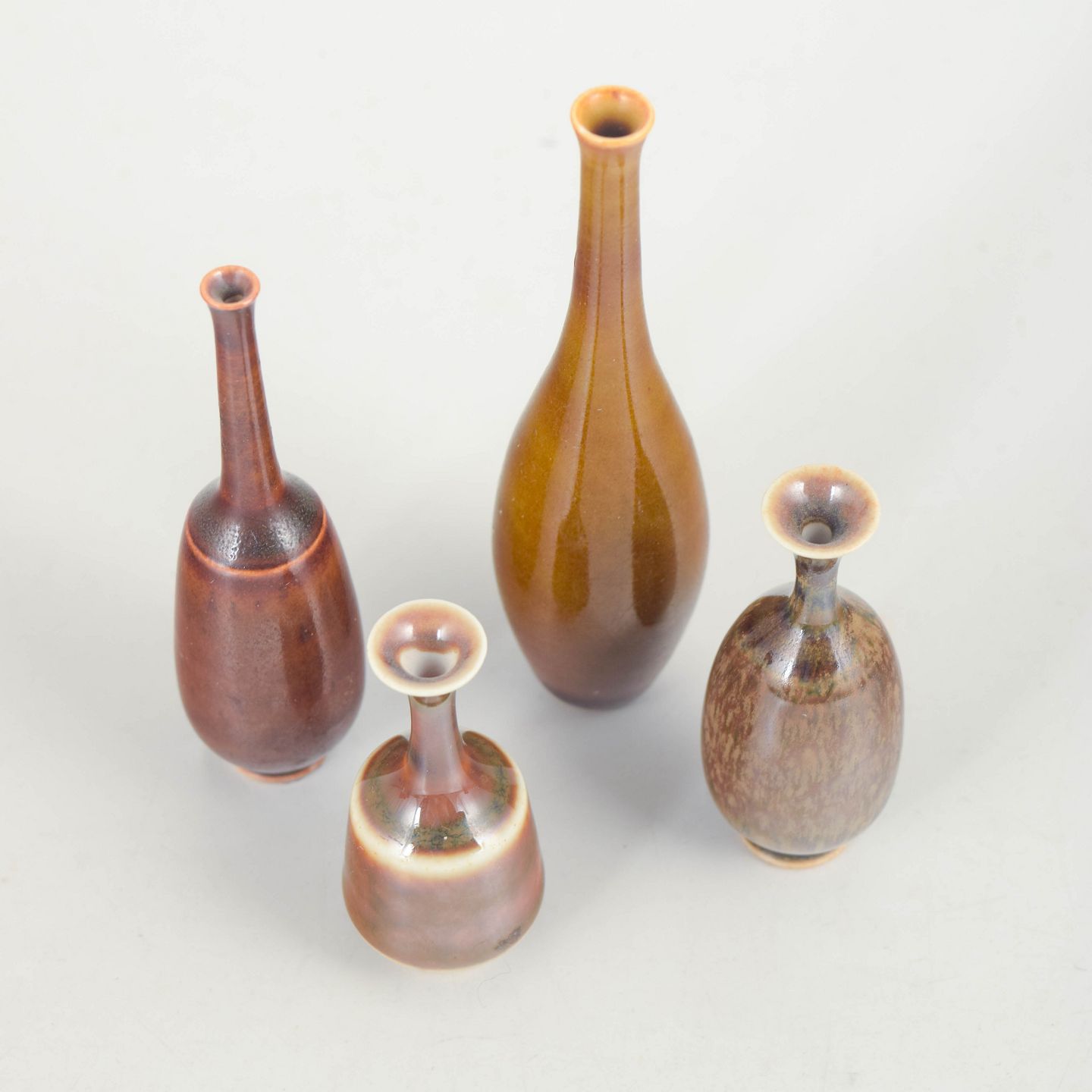 Små drejede stentøjsvaser i slanke og harmoniske former med levende glasurer i varme jordtoner. Typiske for Höganäs’ studioproduktion, hvor proportion, materialitet og glasurens spil er i fokus.
